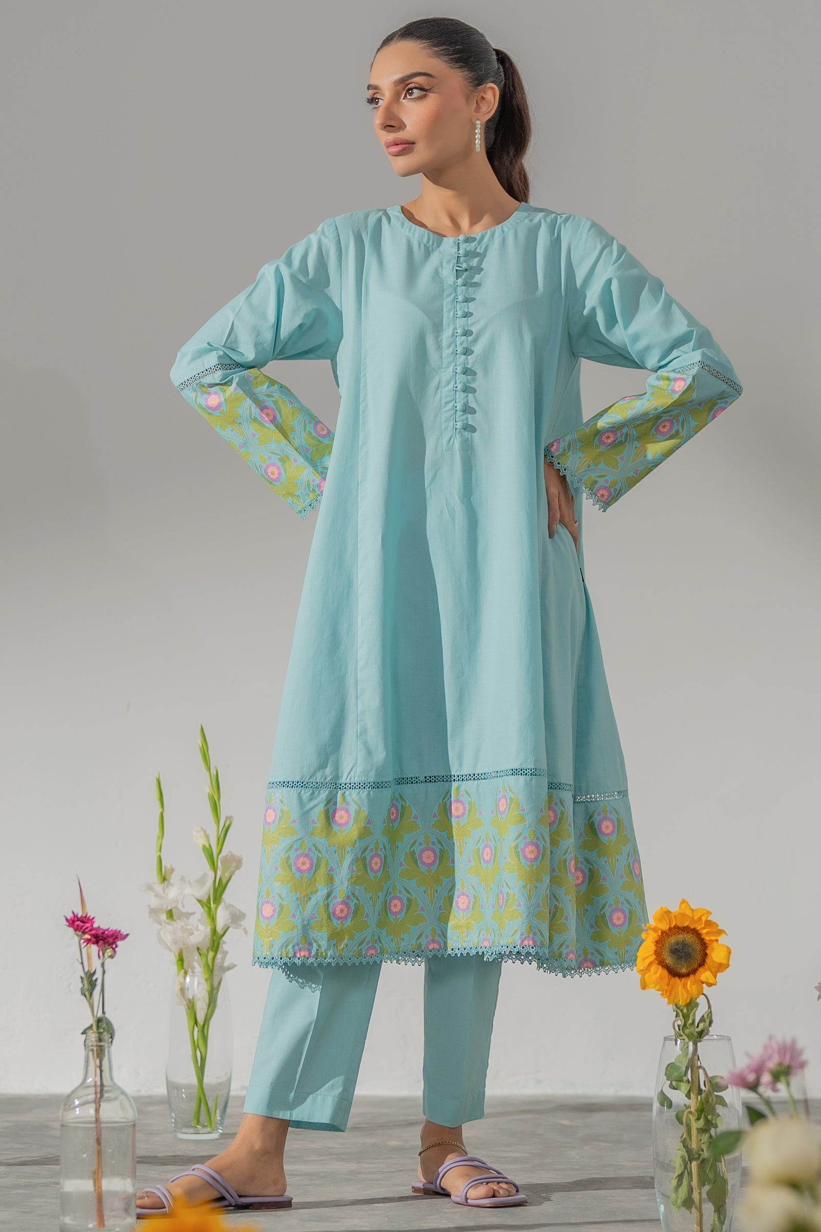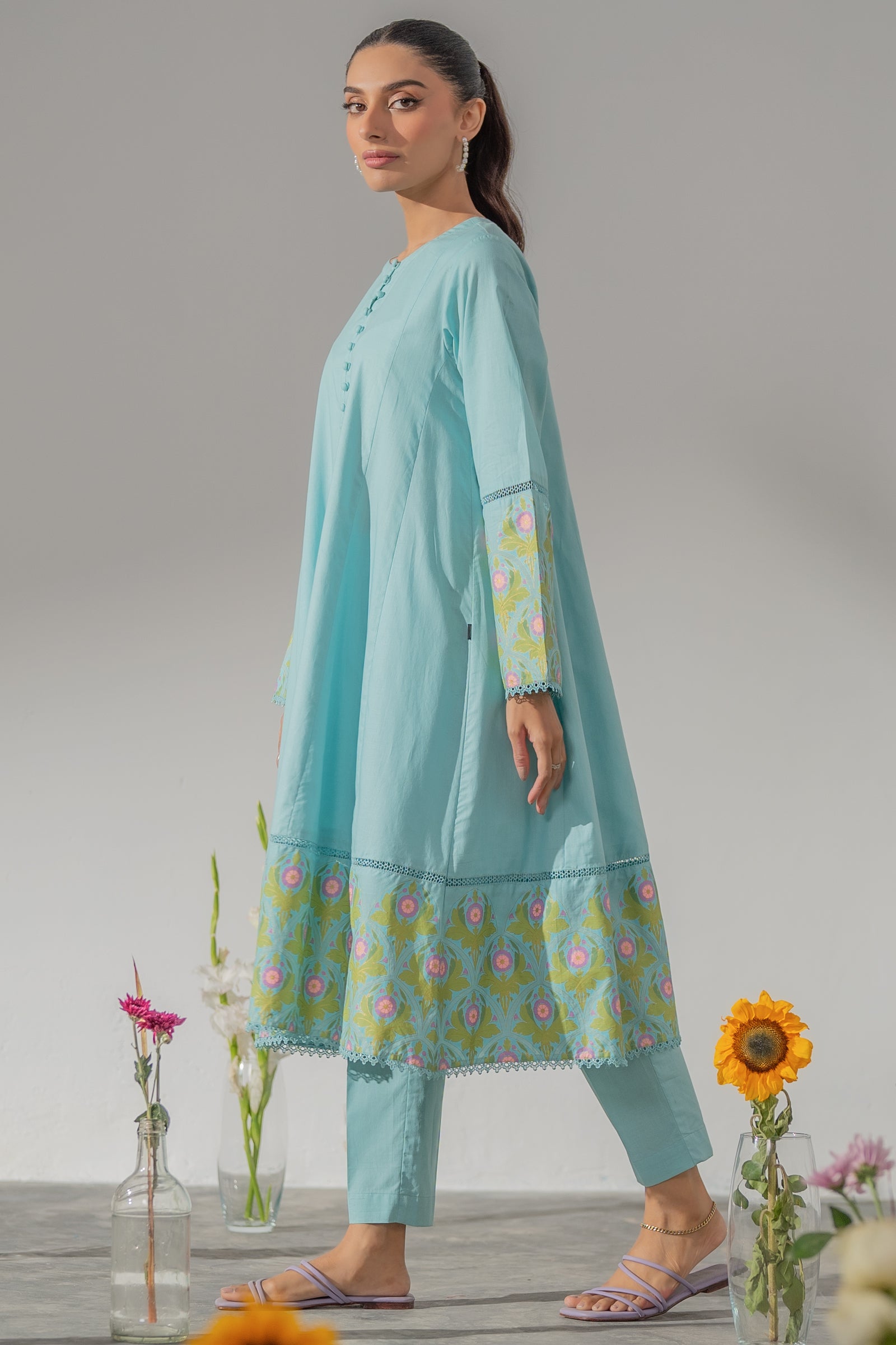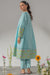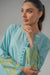This refined mint green flared kurta set featuring floral motifs, paired with straight pants is perfect for a graceful everyday look.