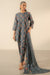 This chic unstitched three-piece set featuring a slate-blue base with vibrant floral prints. The ensemble includes a printed shirt, matching trousers, and a coordinated dupatta for a graceful, contemporary look.