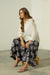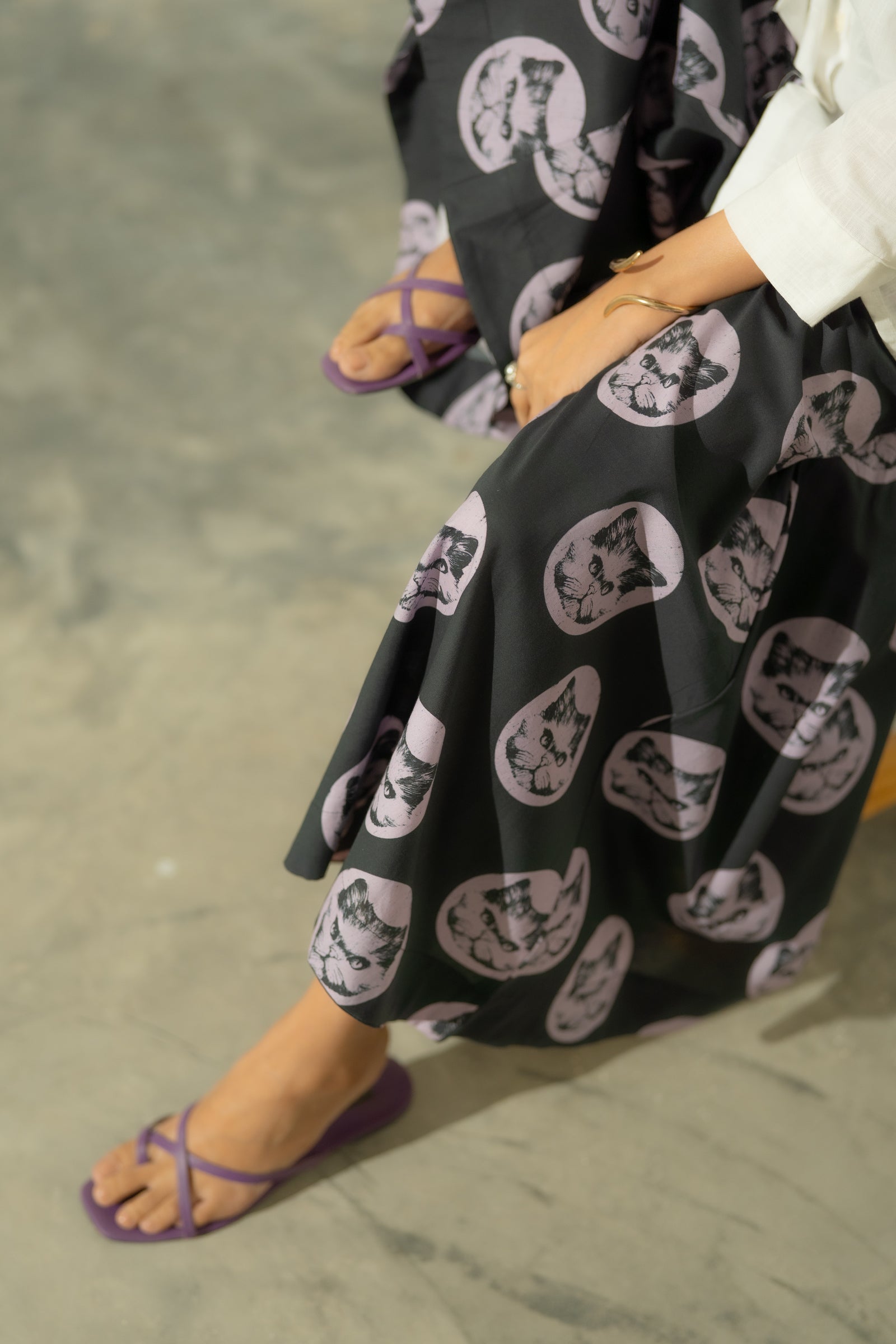 Black wide-leg pants with a playful all-over cat face print and an easy, relaxed drape.
