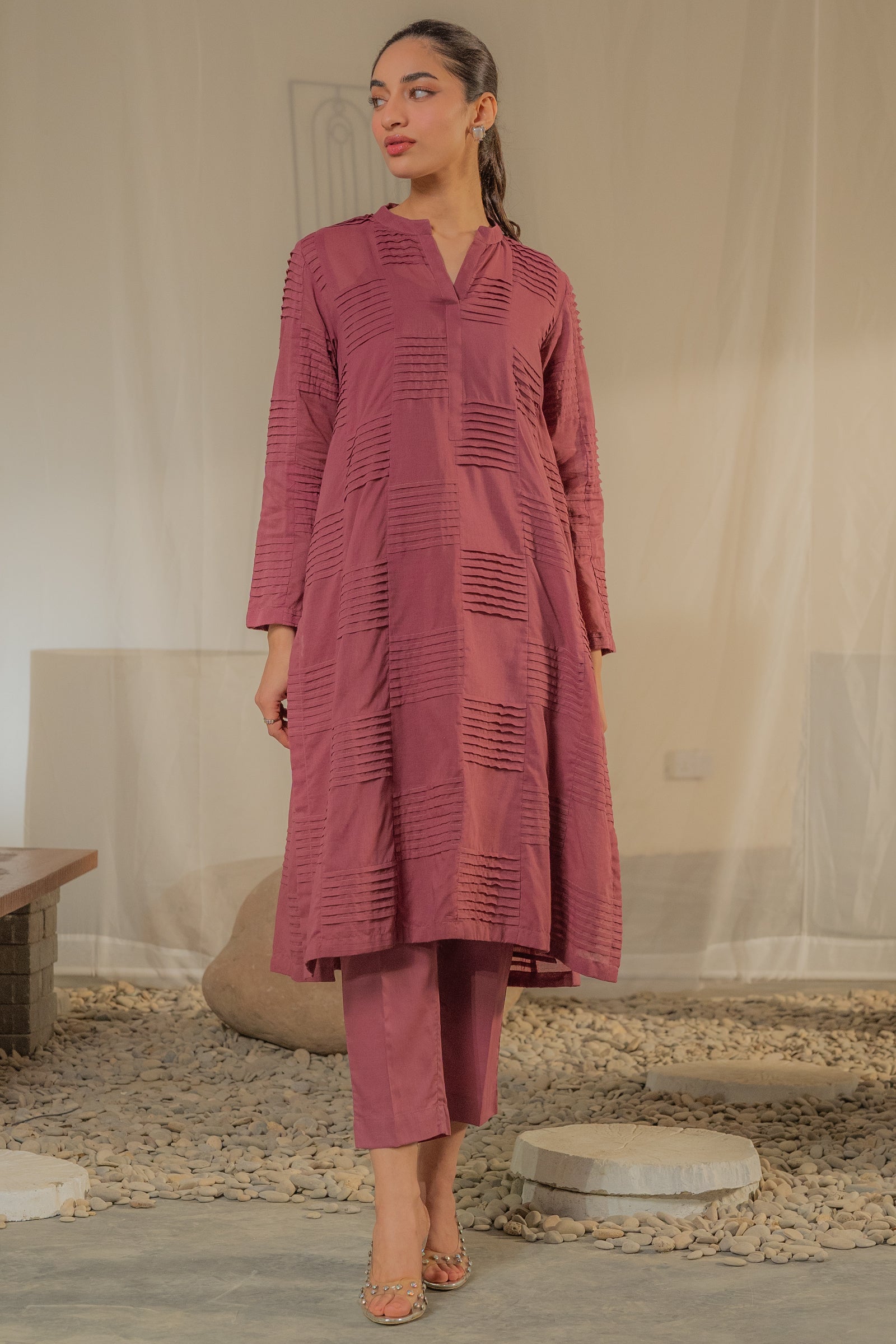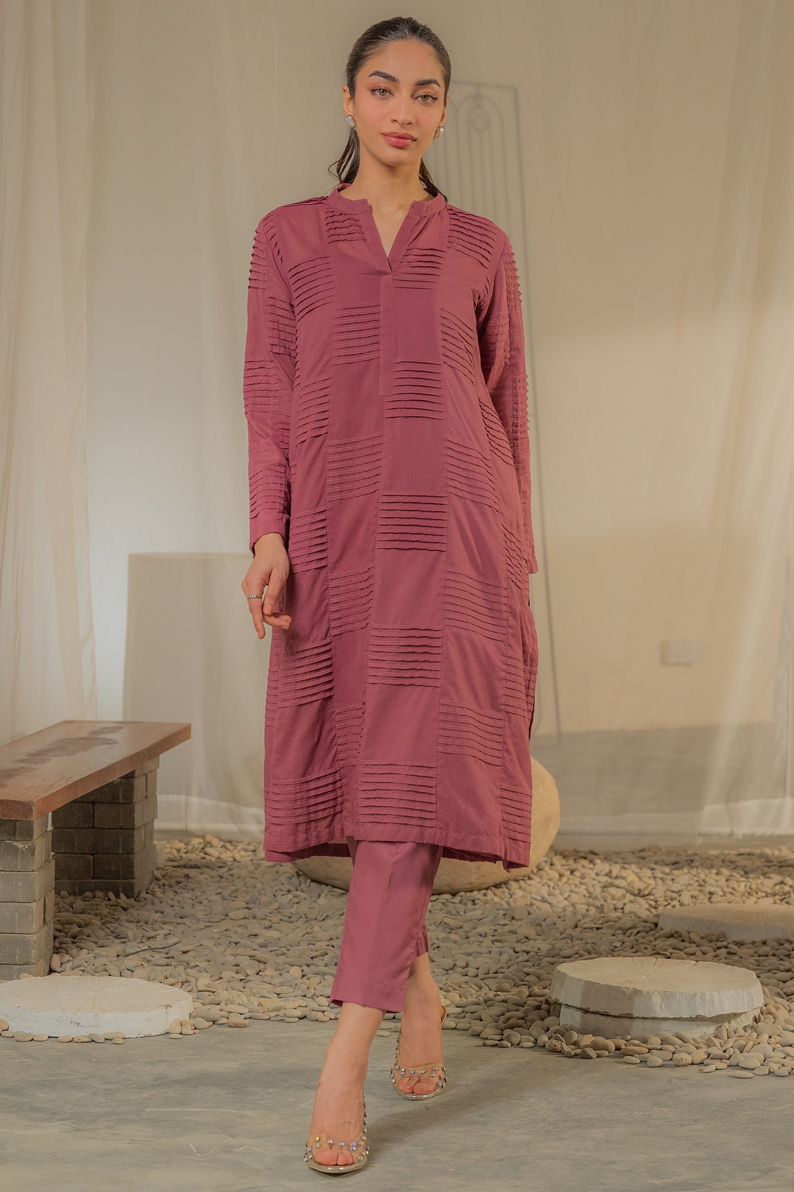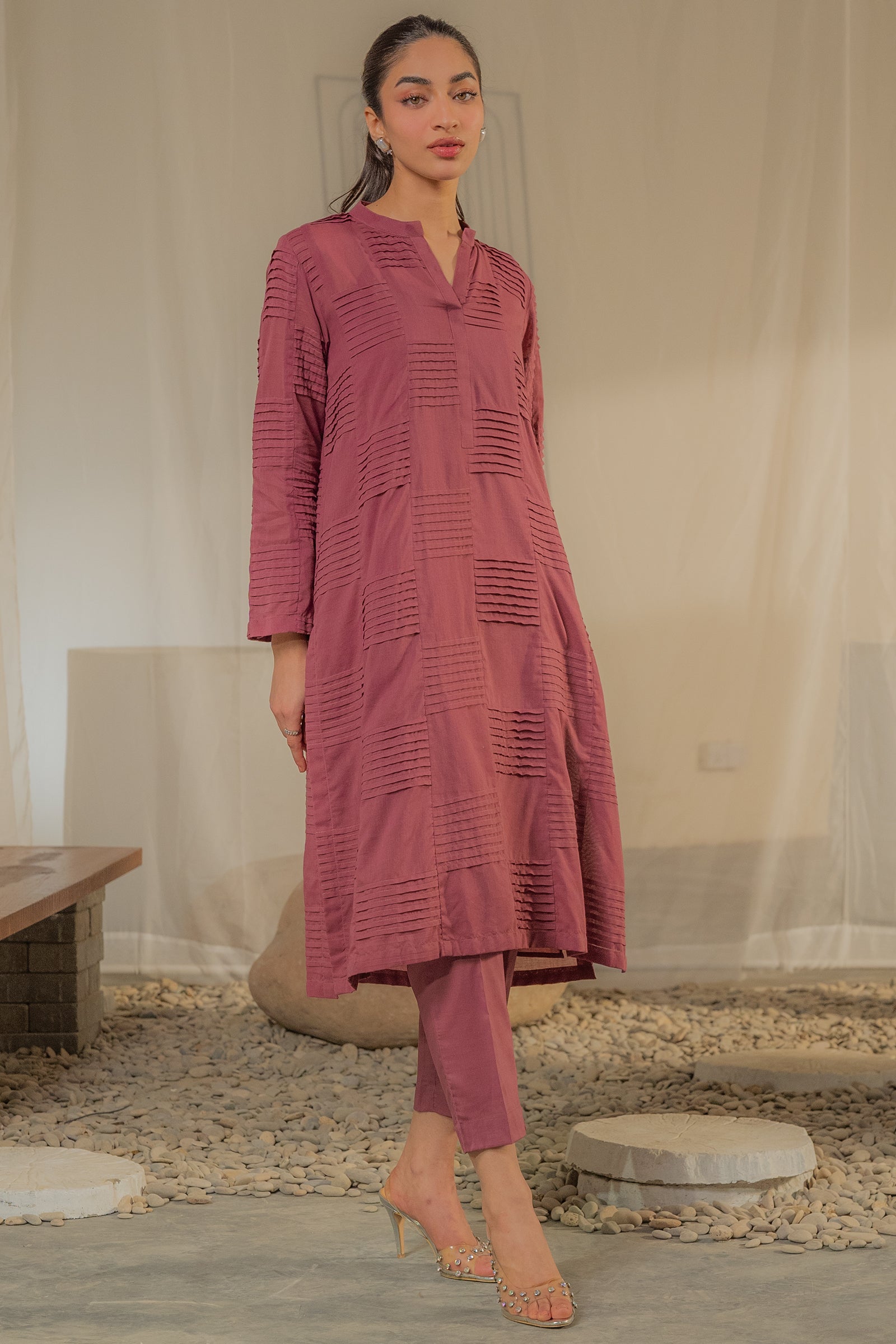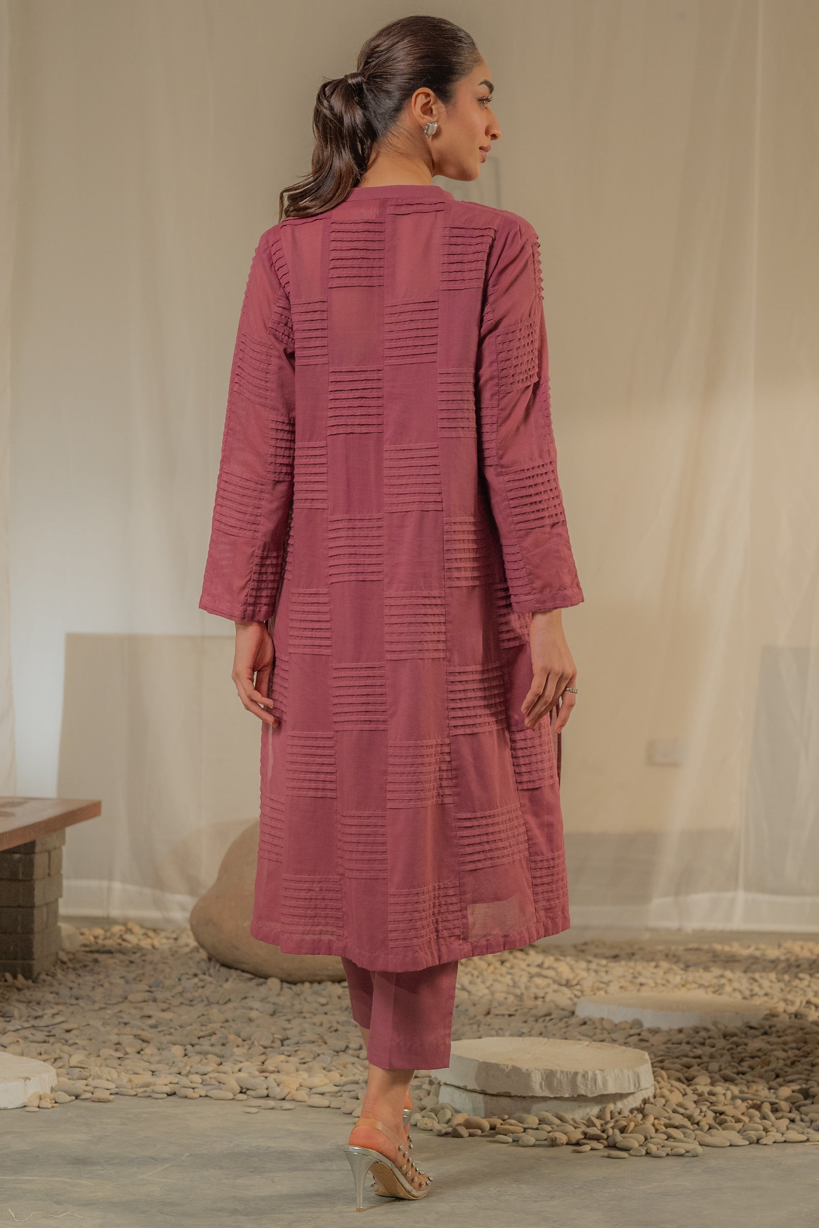 Designed with stitch action, this tea pink kurta showcases delicate surface detailing that adds depth and quiet elegance paired with straight pants. Perfect for an evening out