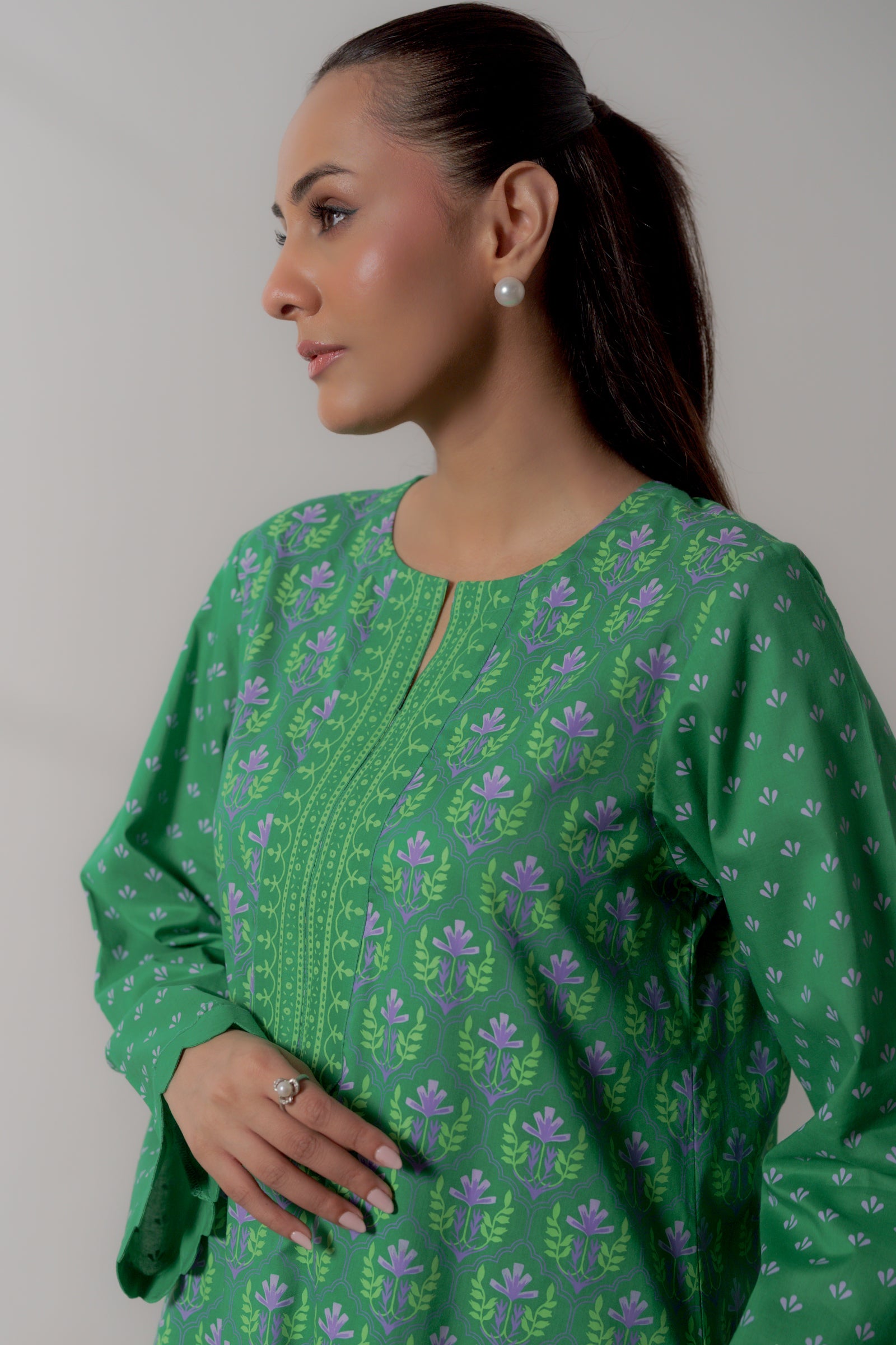 This refreshing green kurta set adorned with delicate prints and scalloped sleeves, perfect for effortless festive elegance.