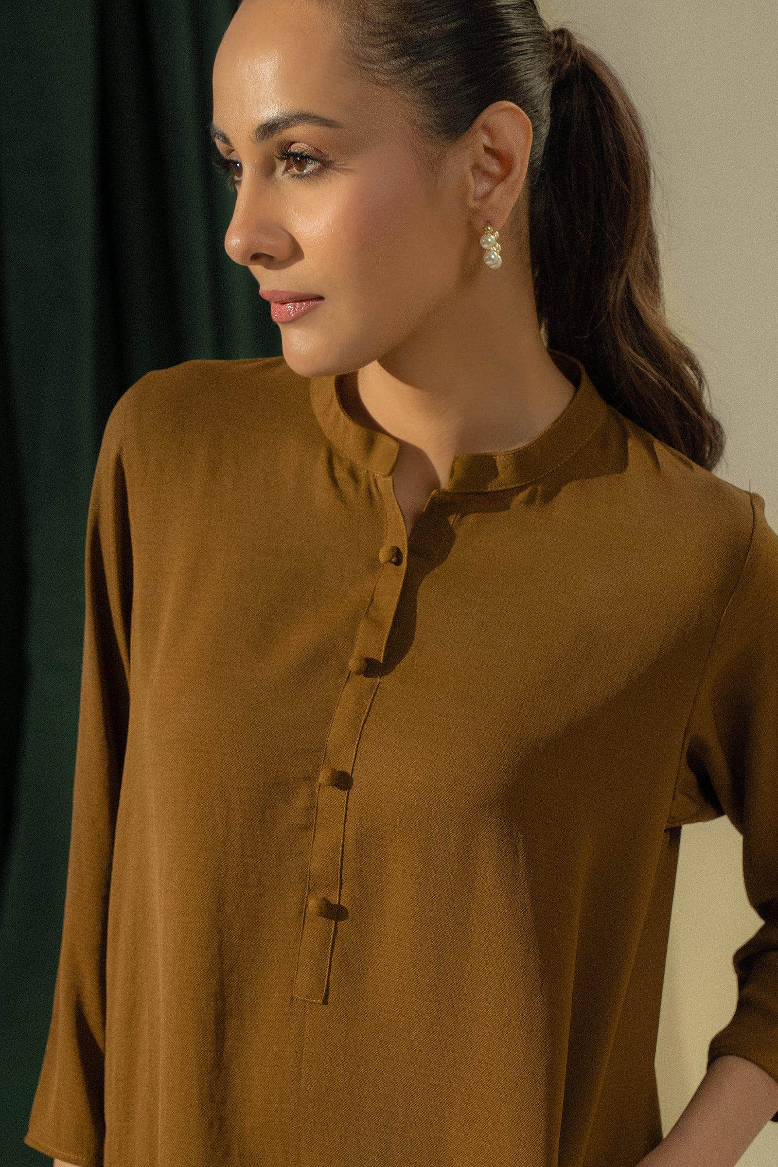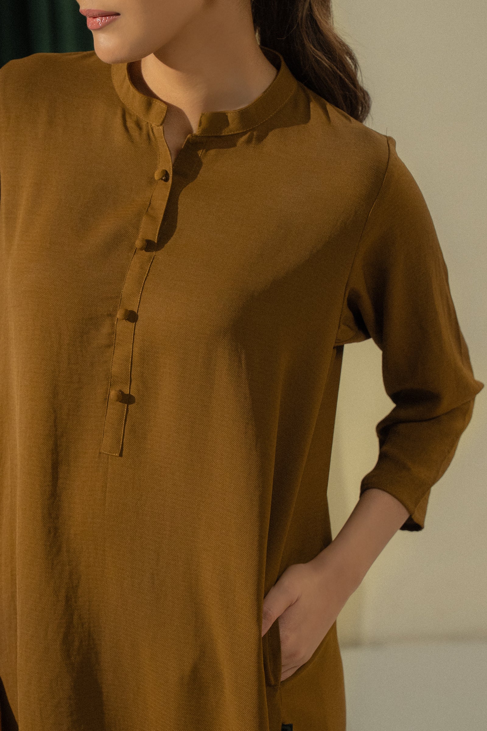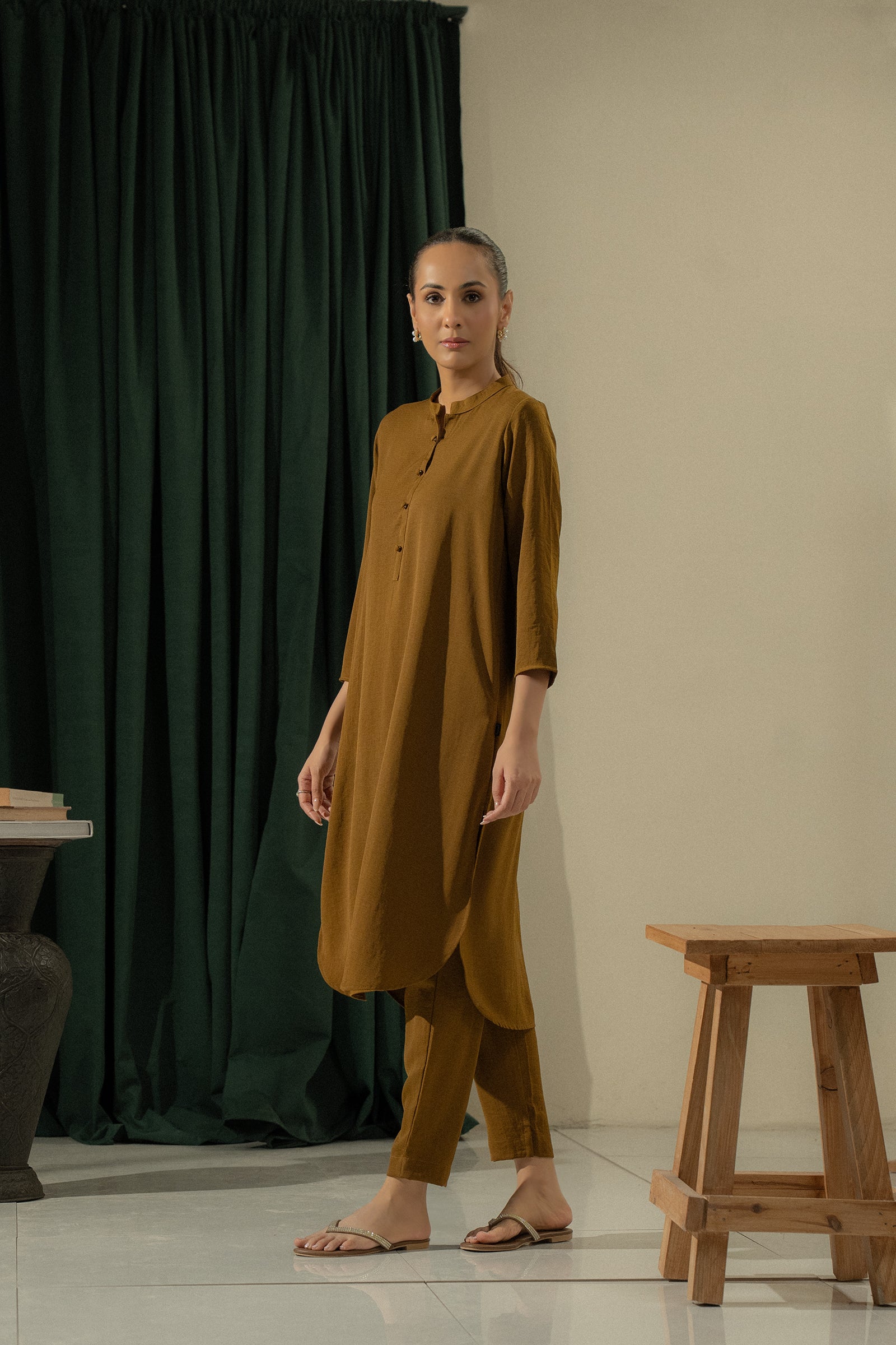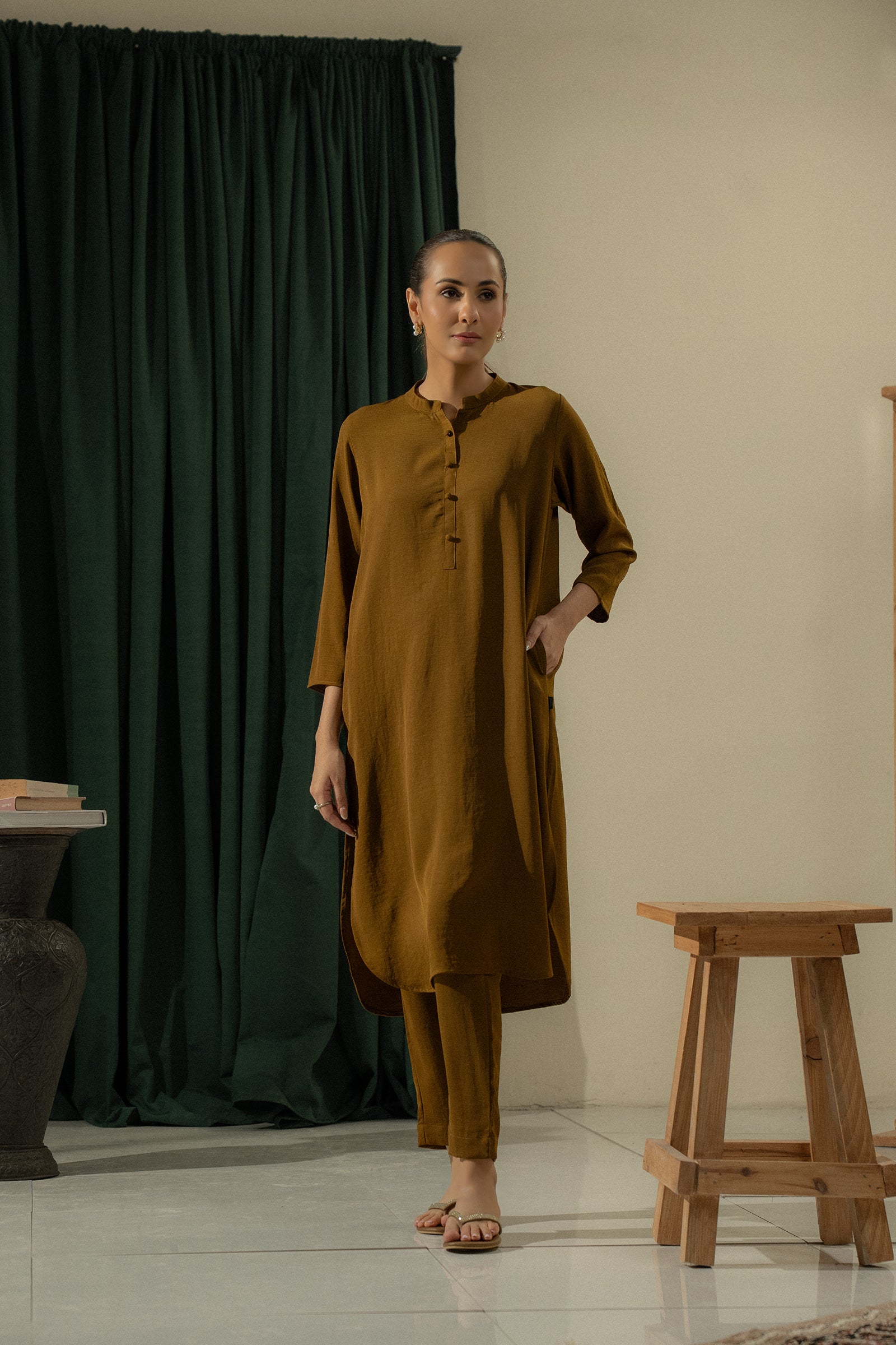 Make a stunning impression this winter with this brown colored kurta with side pockets paired with straight pants.