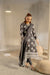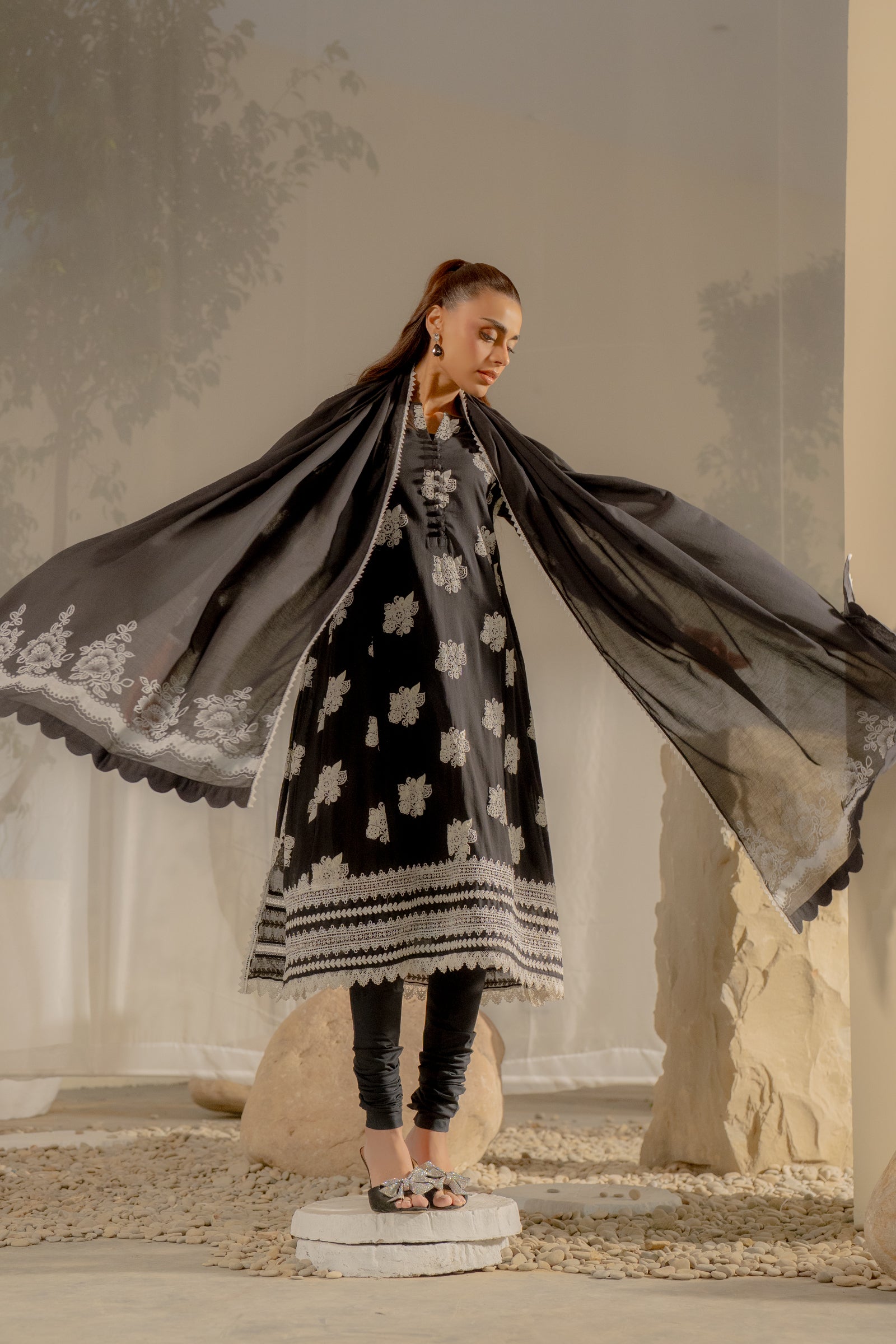 A striking black luxury ensemble adorned with puff print paired with a churidar and a richly print dupatta. Elegant, bold, and perfect for sophisticated evening wear.