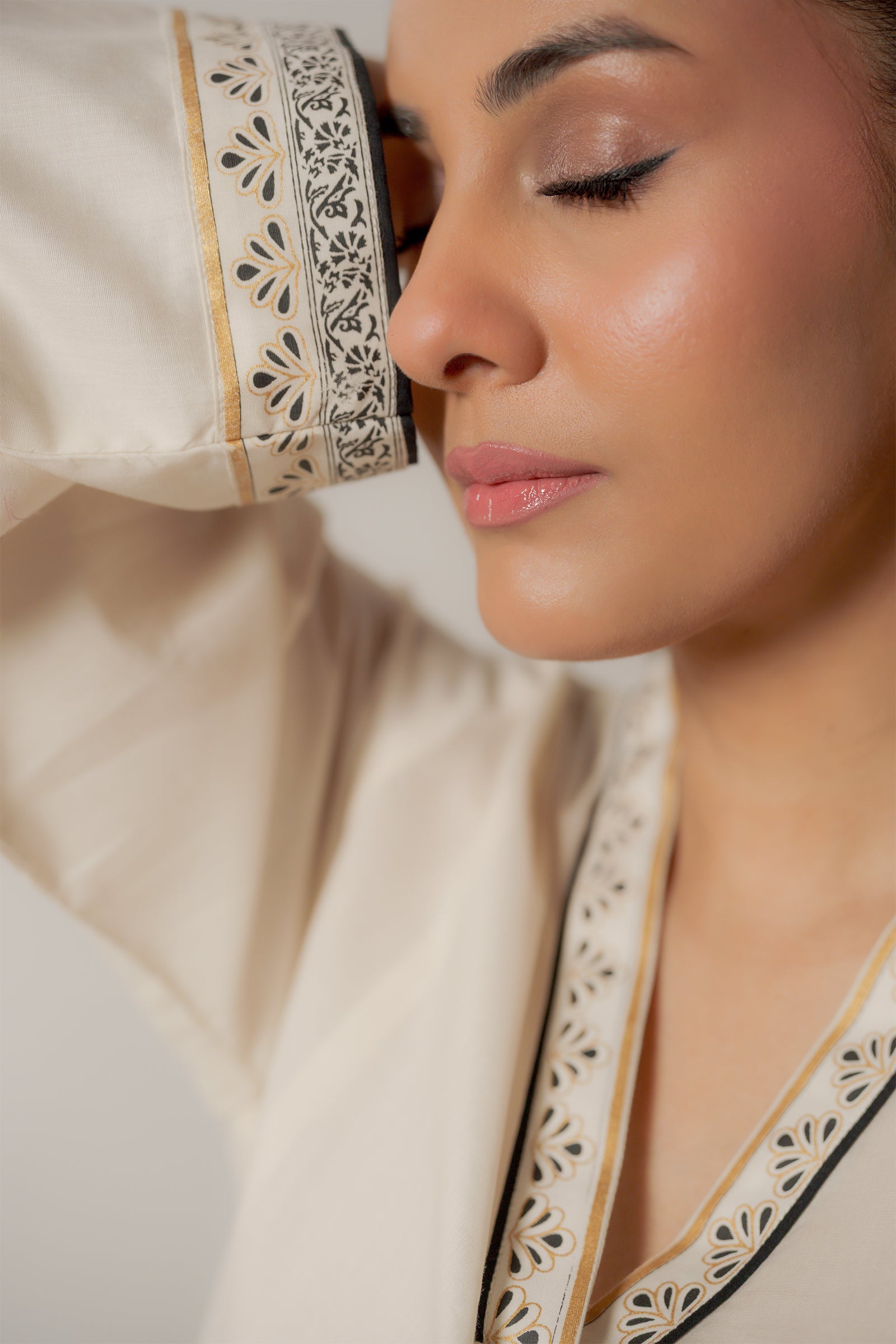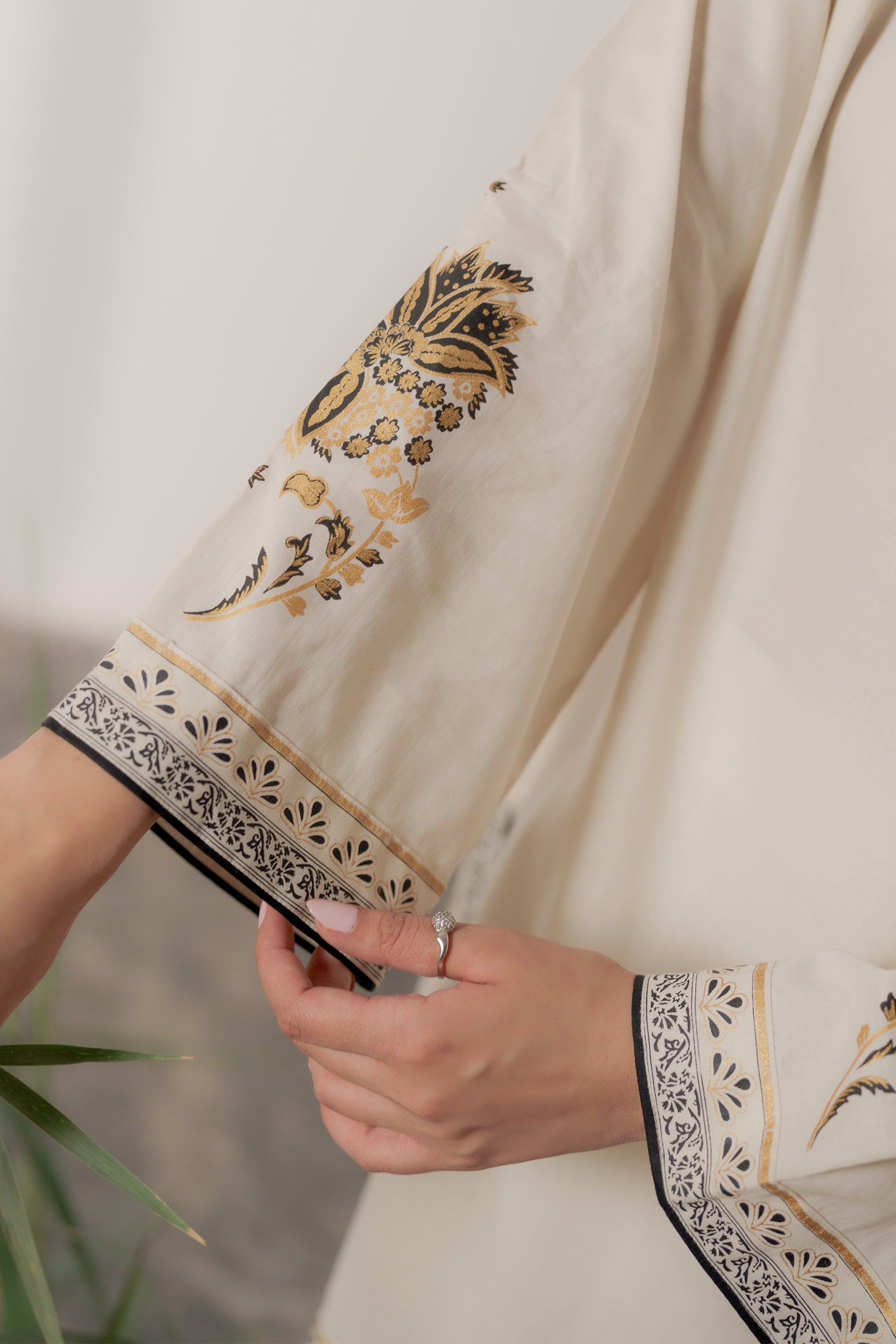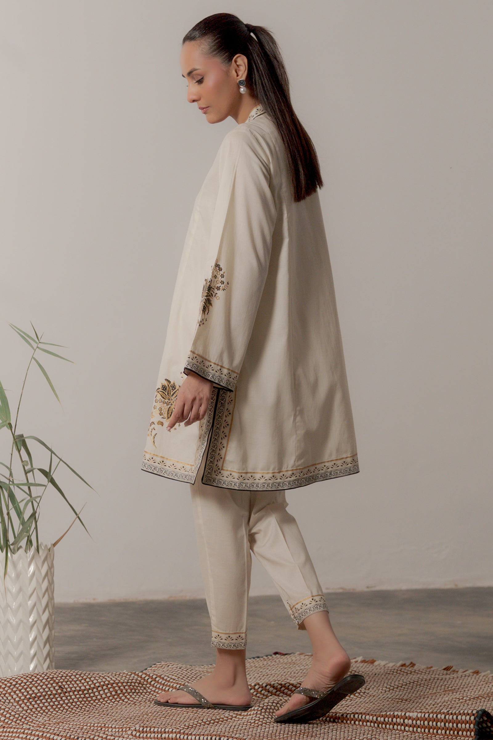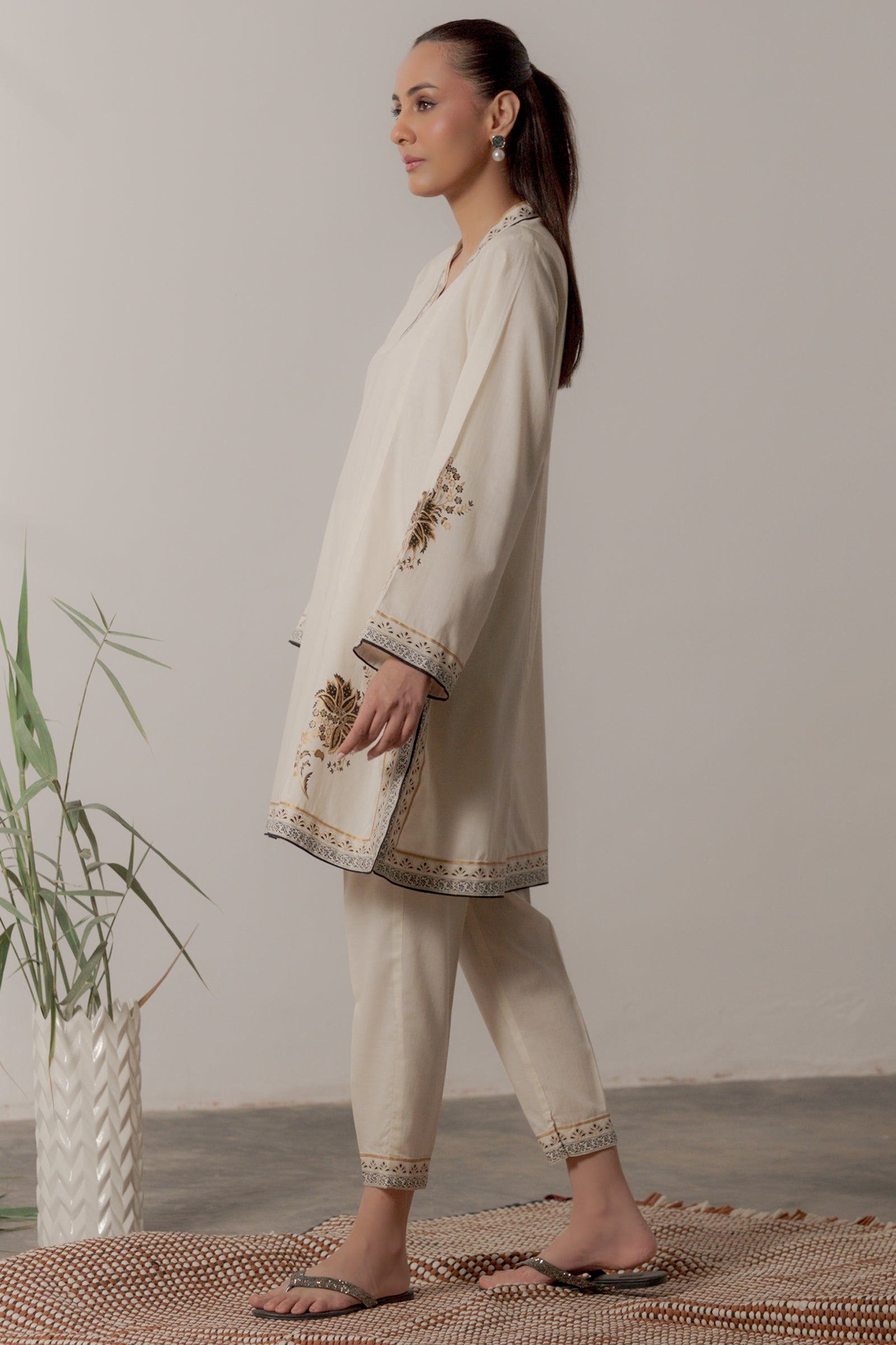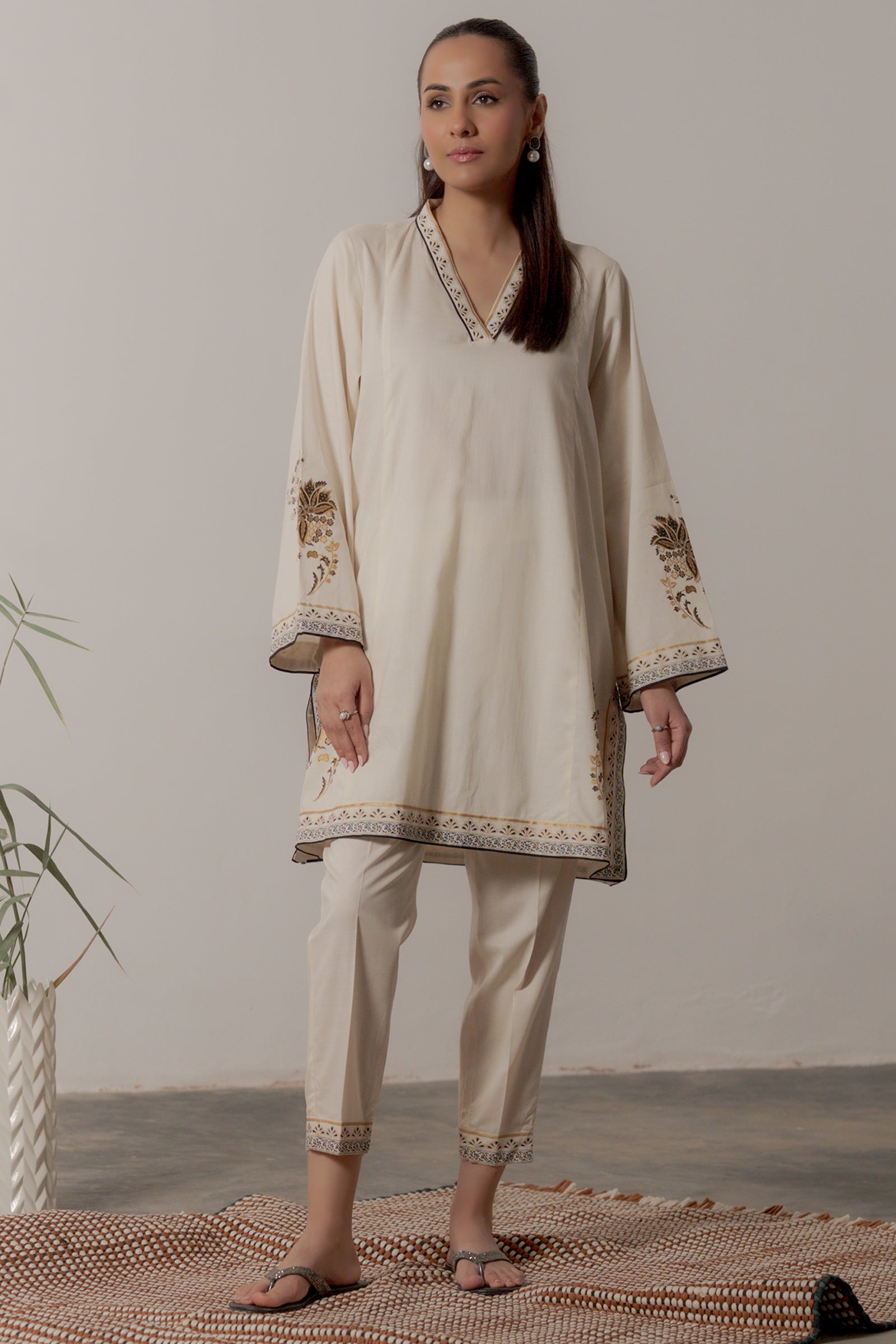 This cream colored kurta with hand screen print paired with sleek shalwar is effortlessly classy and chic.