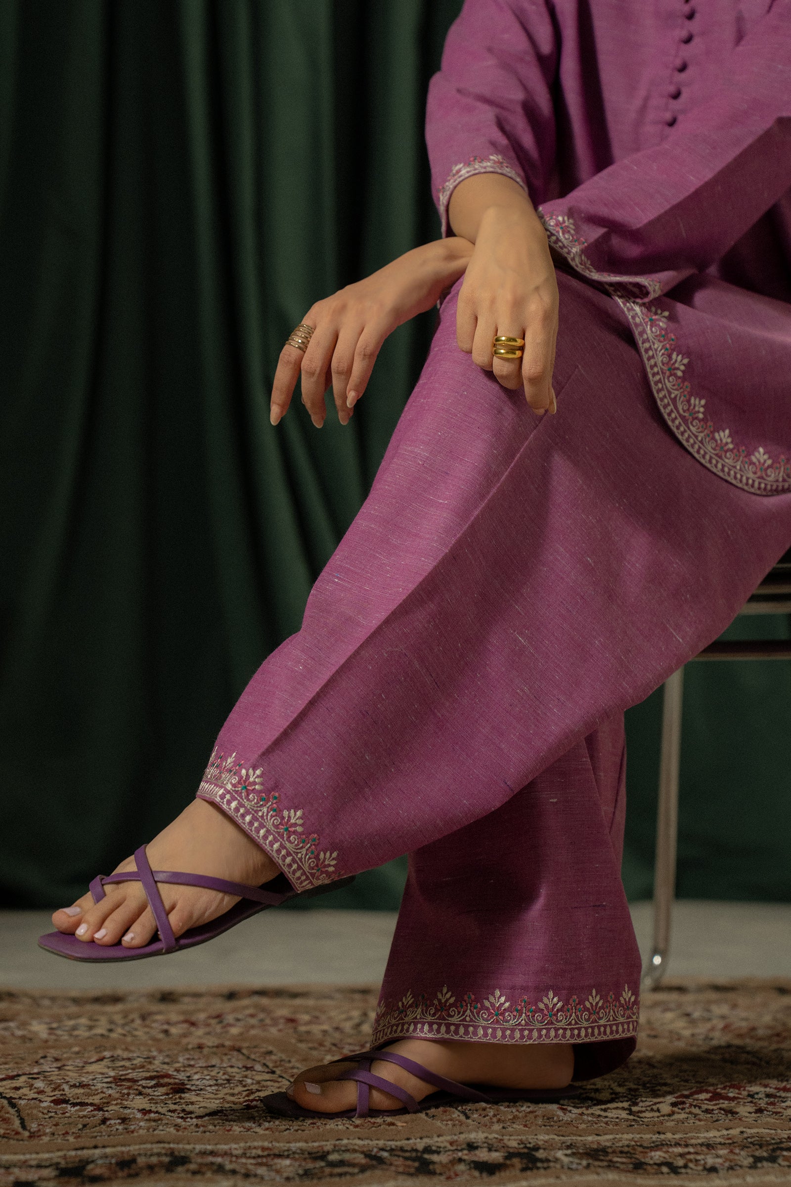 Embrace this winter with confidence in this purple embroidered kurta paired with farshi shalwar.