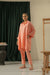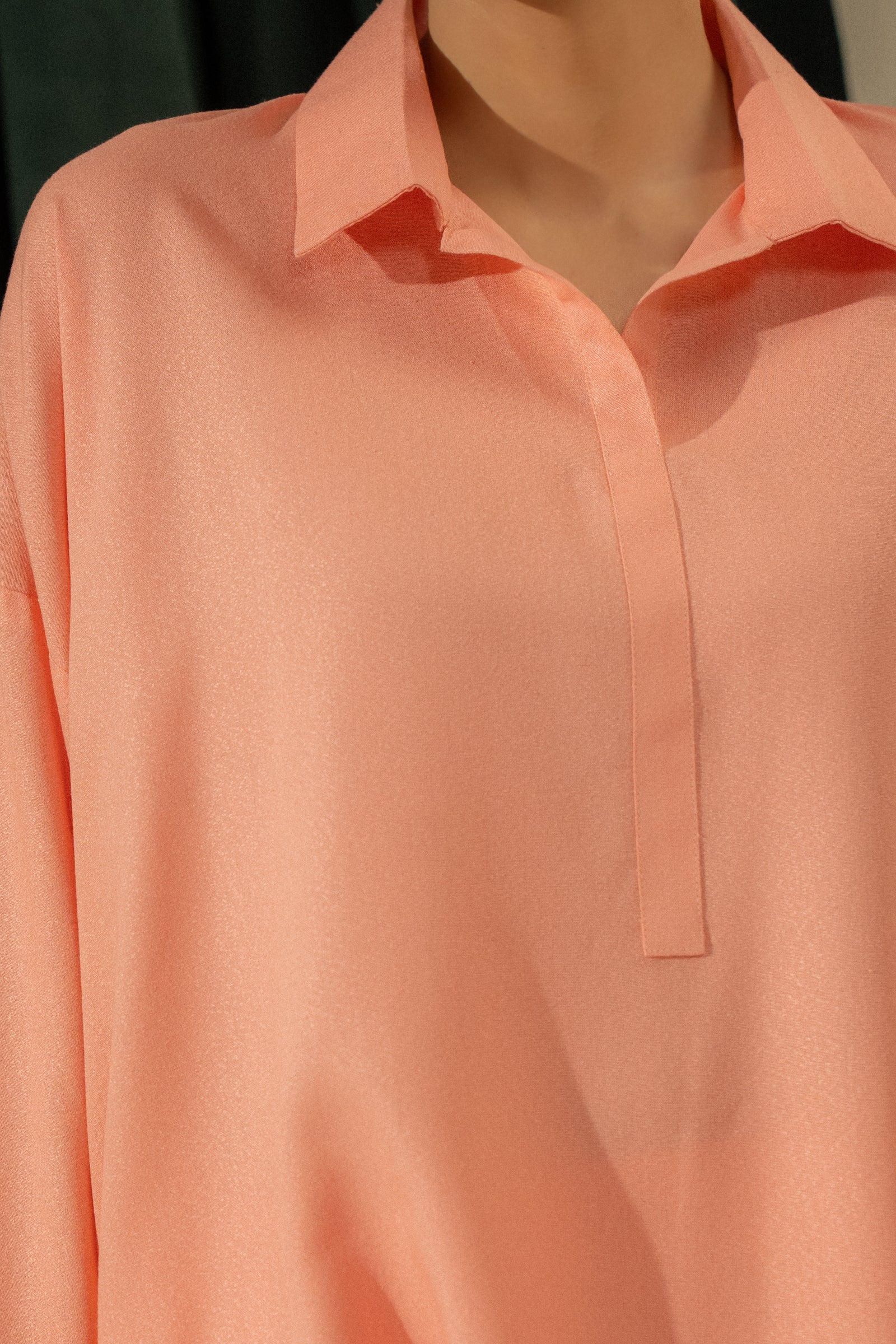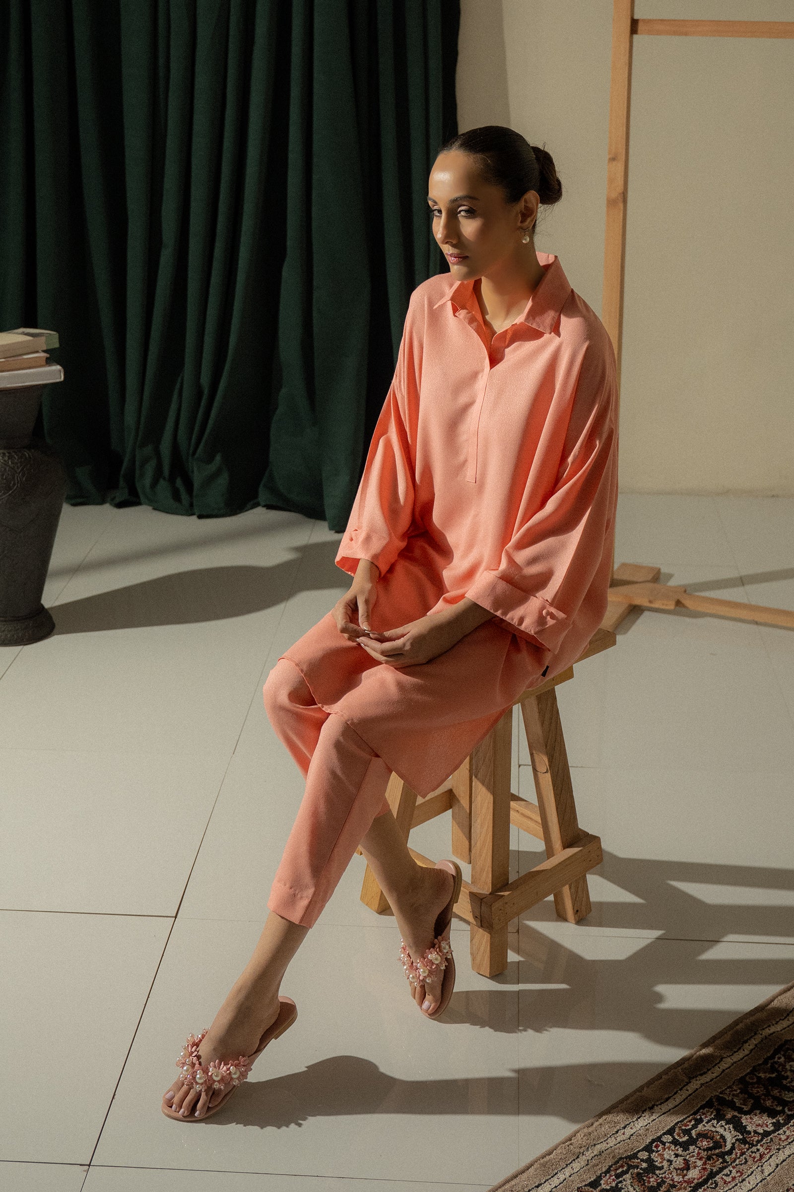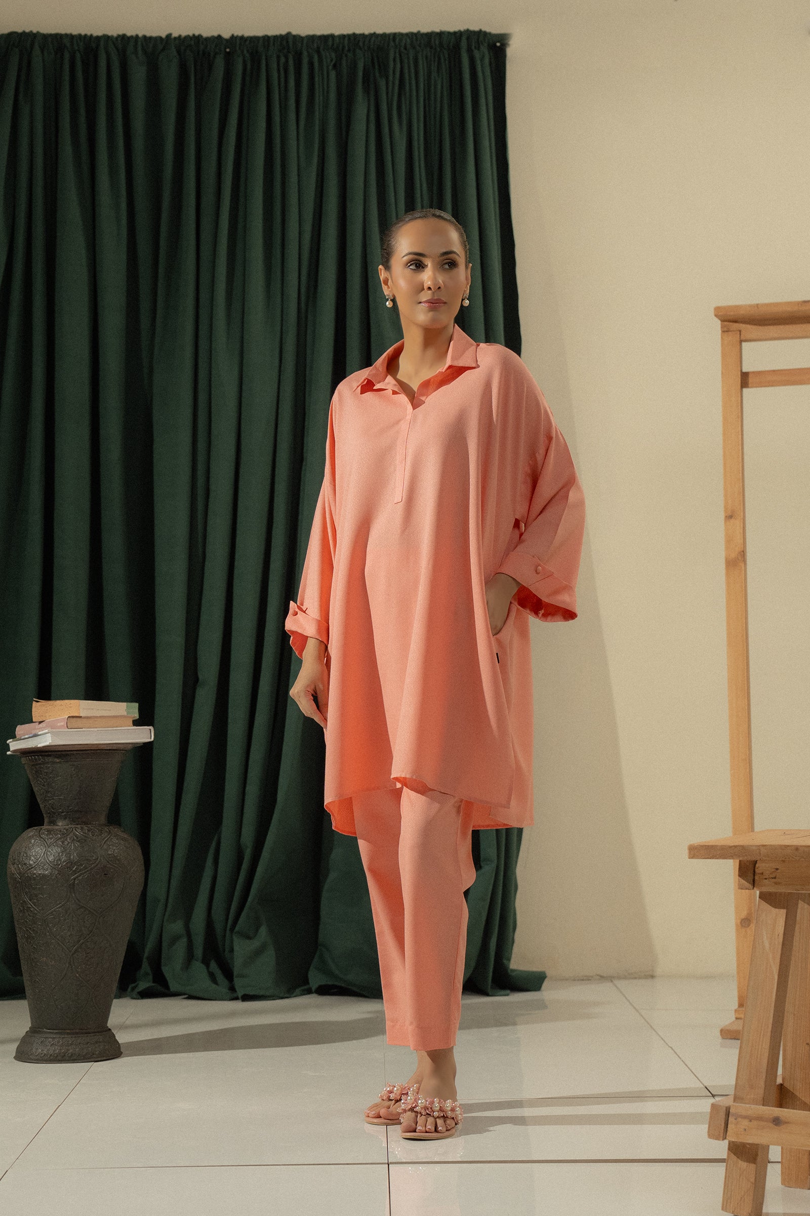 Step into effortless style with this peach two-piece set, featuring a relaxed collared kurta with rolled sleeves paired with straight pants.