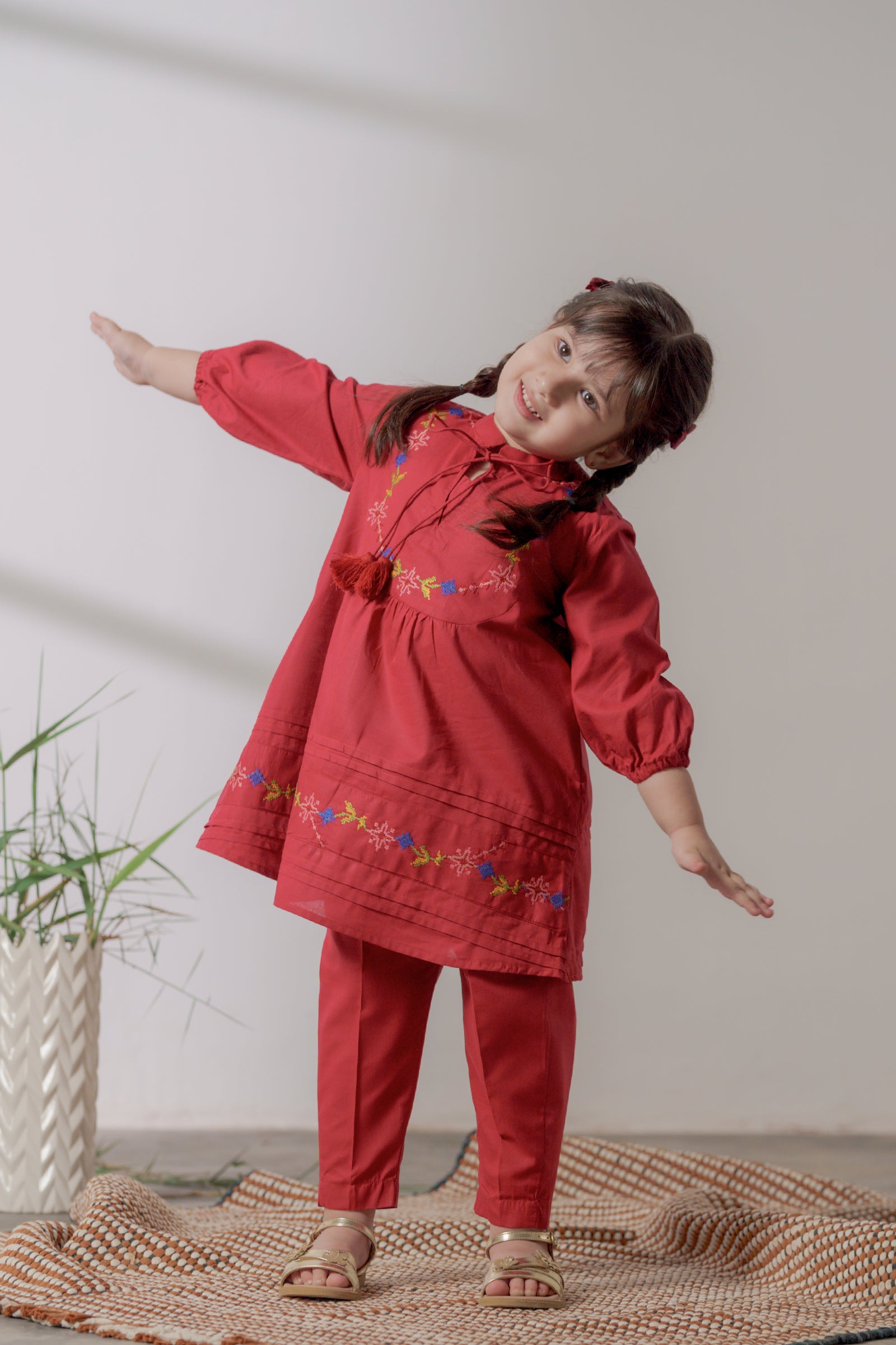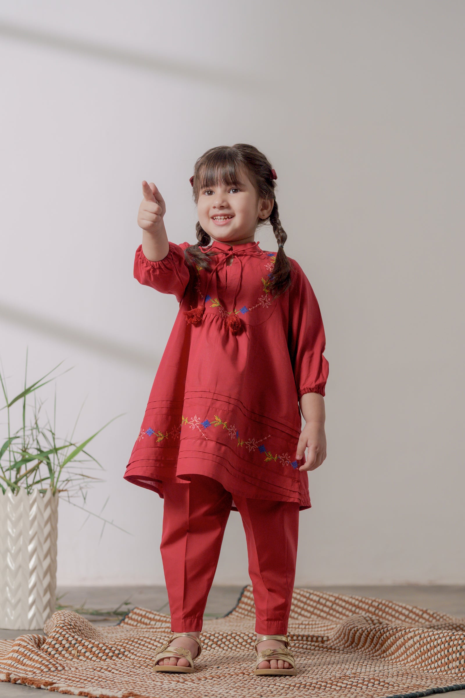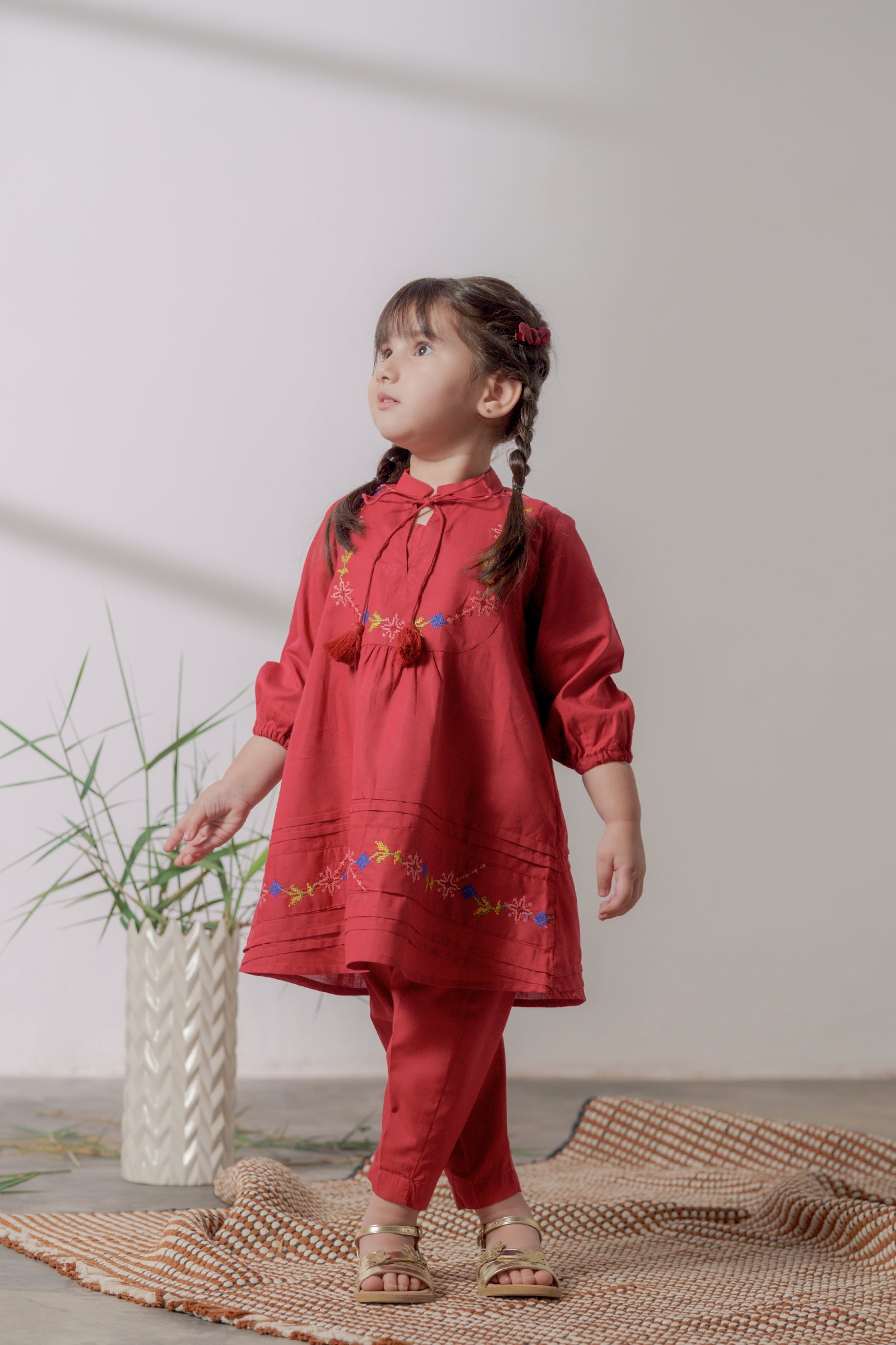 This charming red outfit for little girls, featuring delicate embroidery and playful tassel details for a cute festive look.