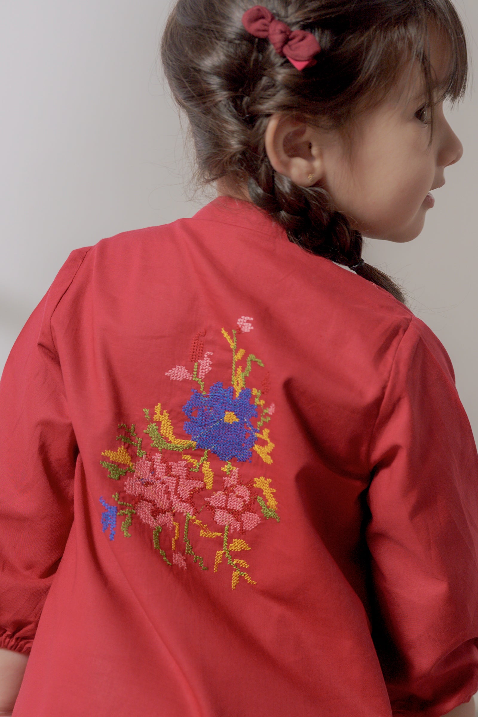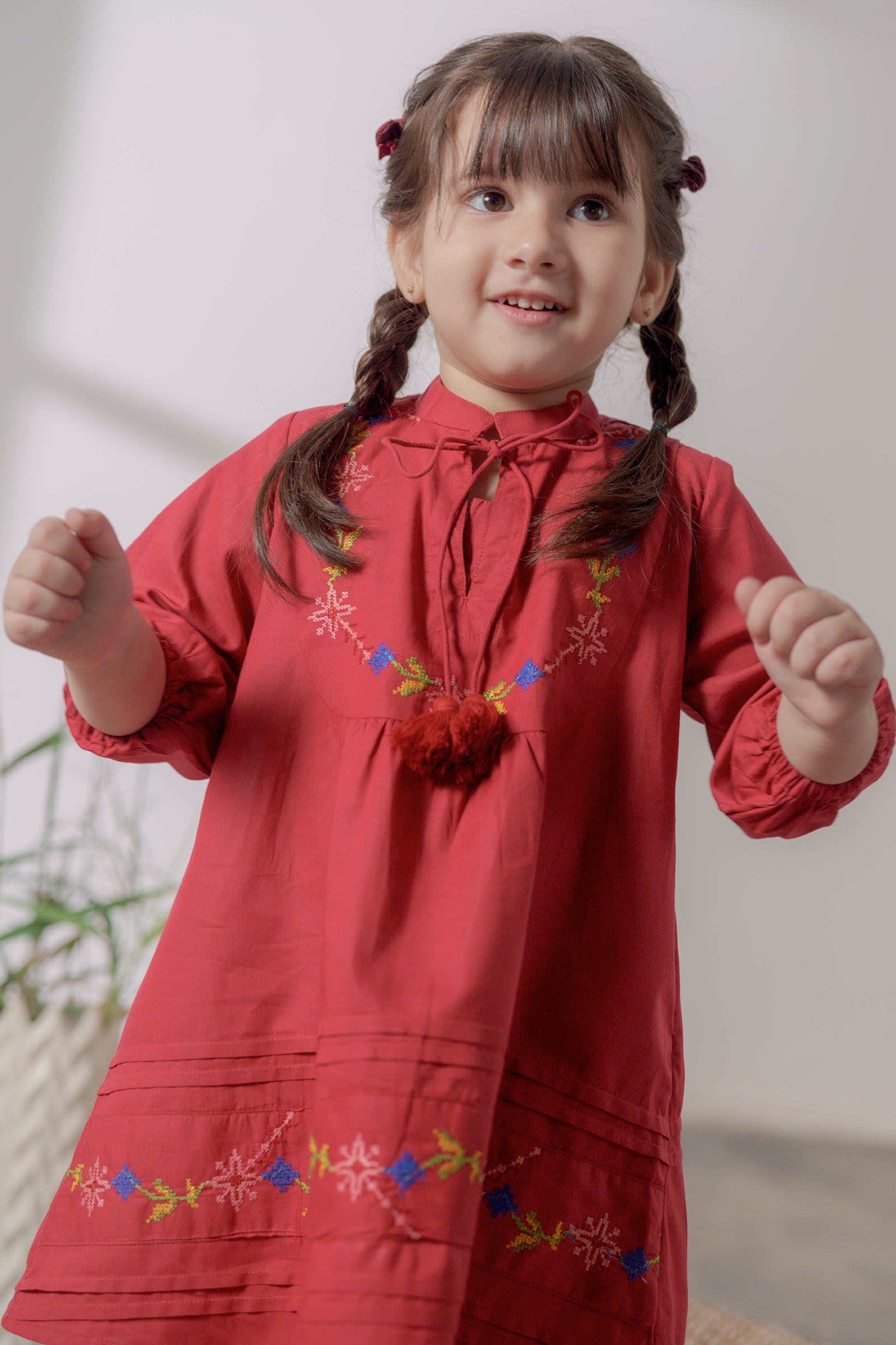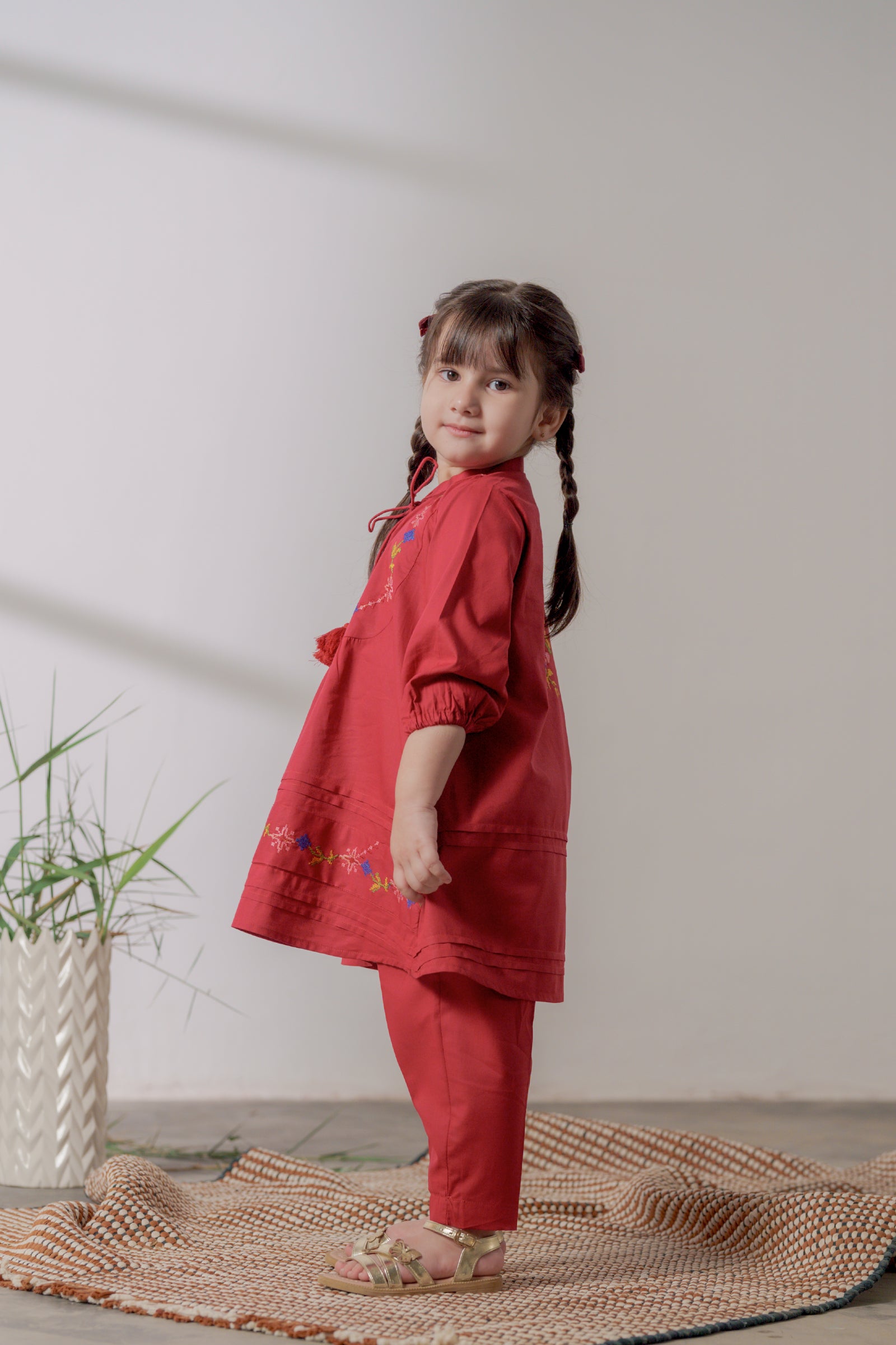 This charming red outfit for little girls, featuring delicate embroidery and playful tassel details for a cute festive look.