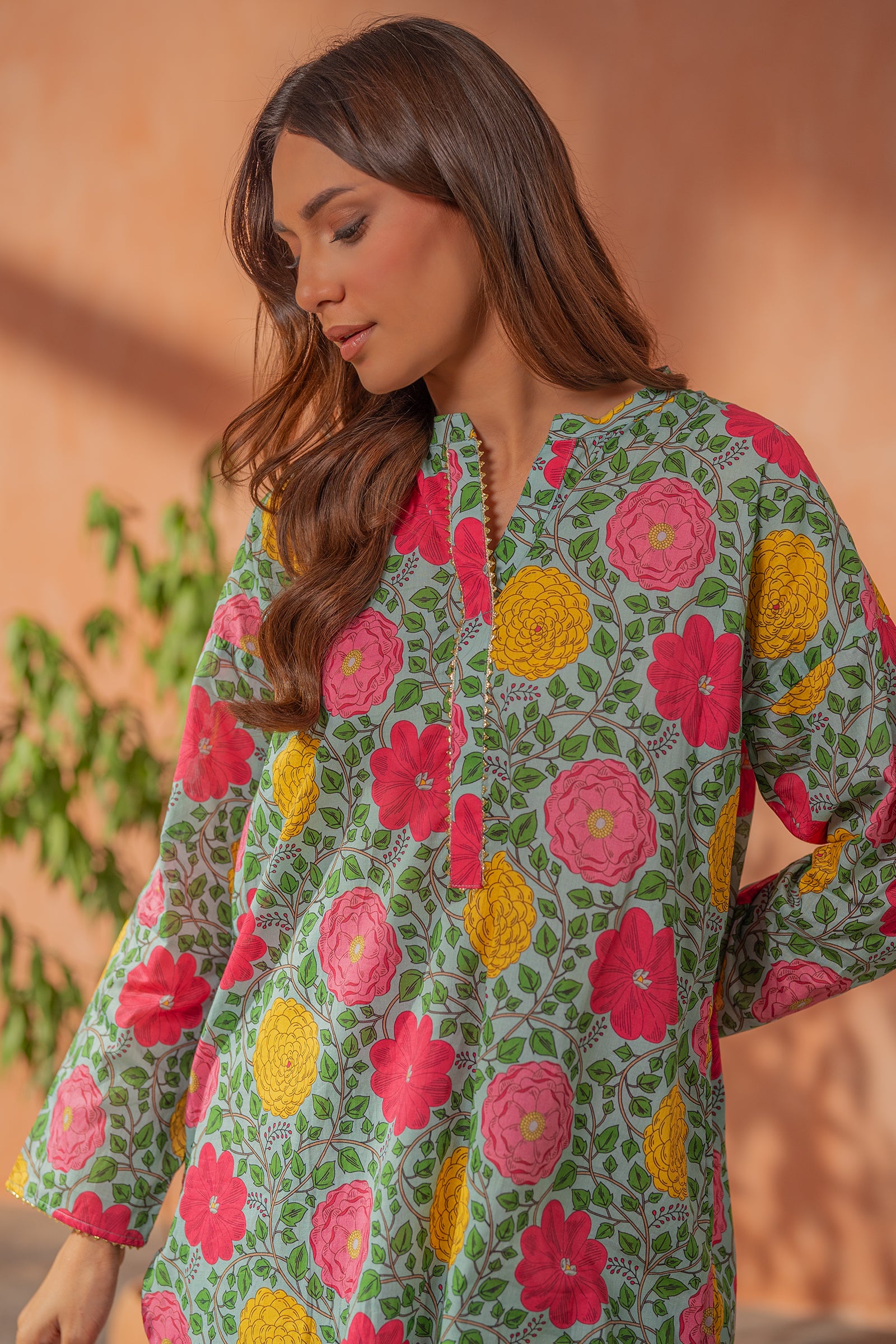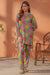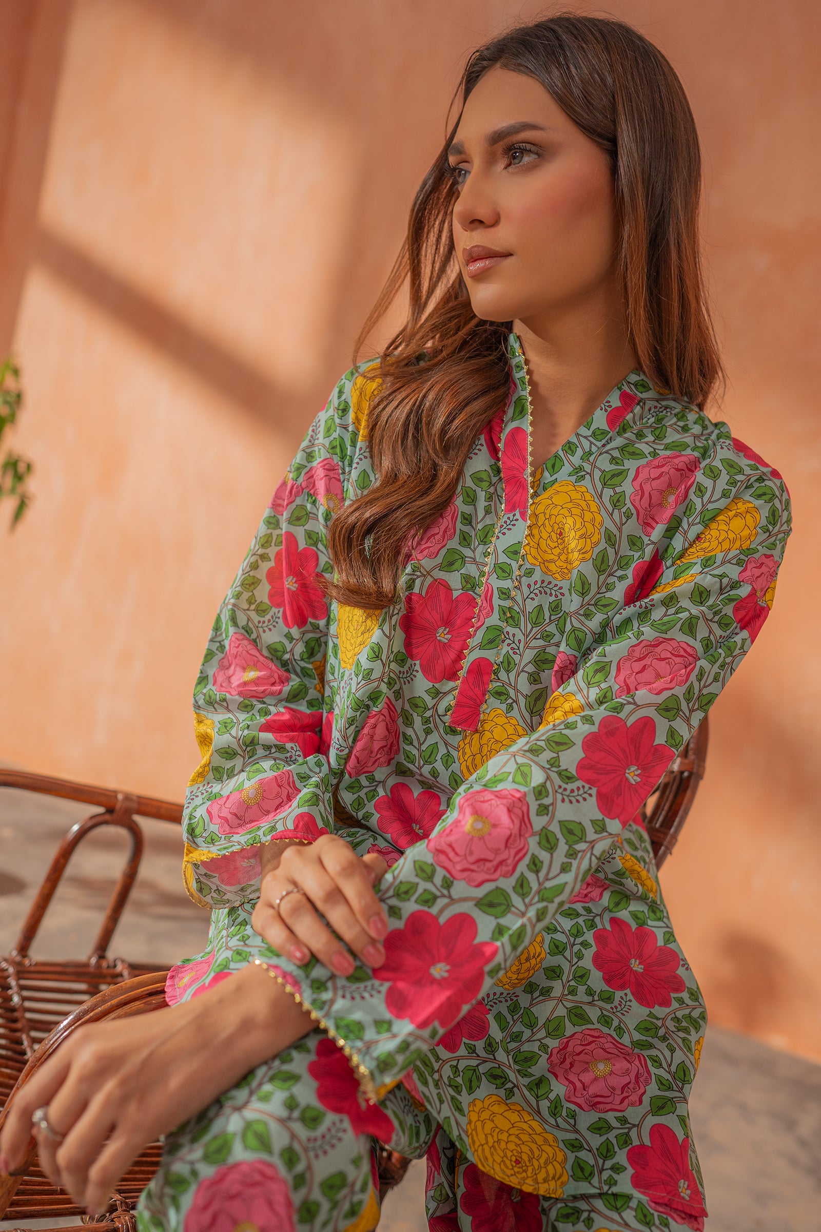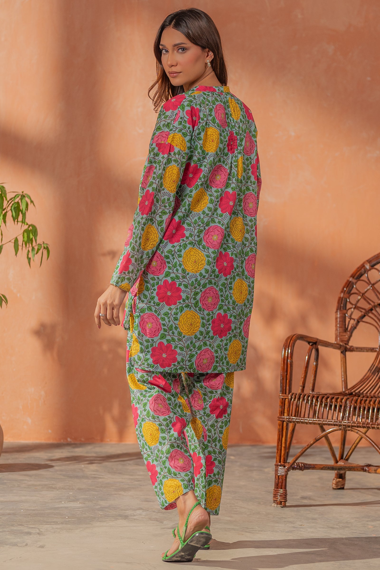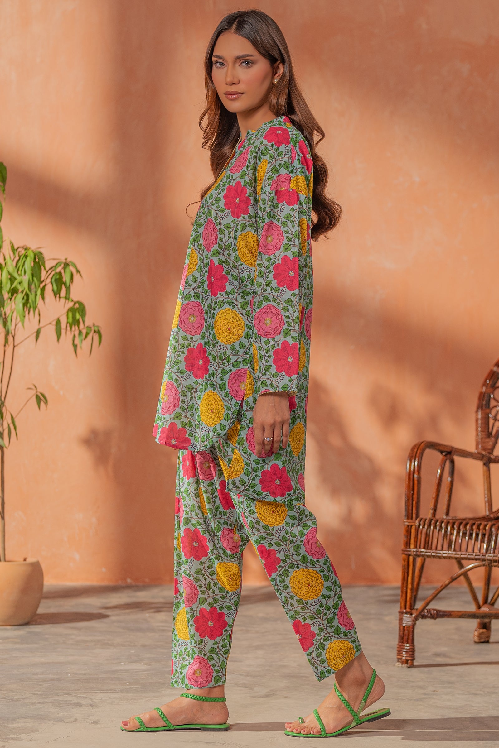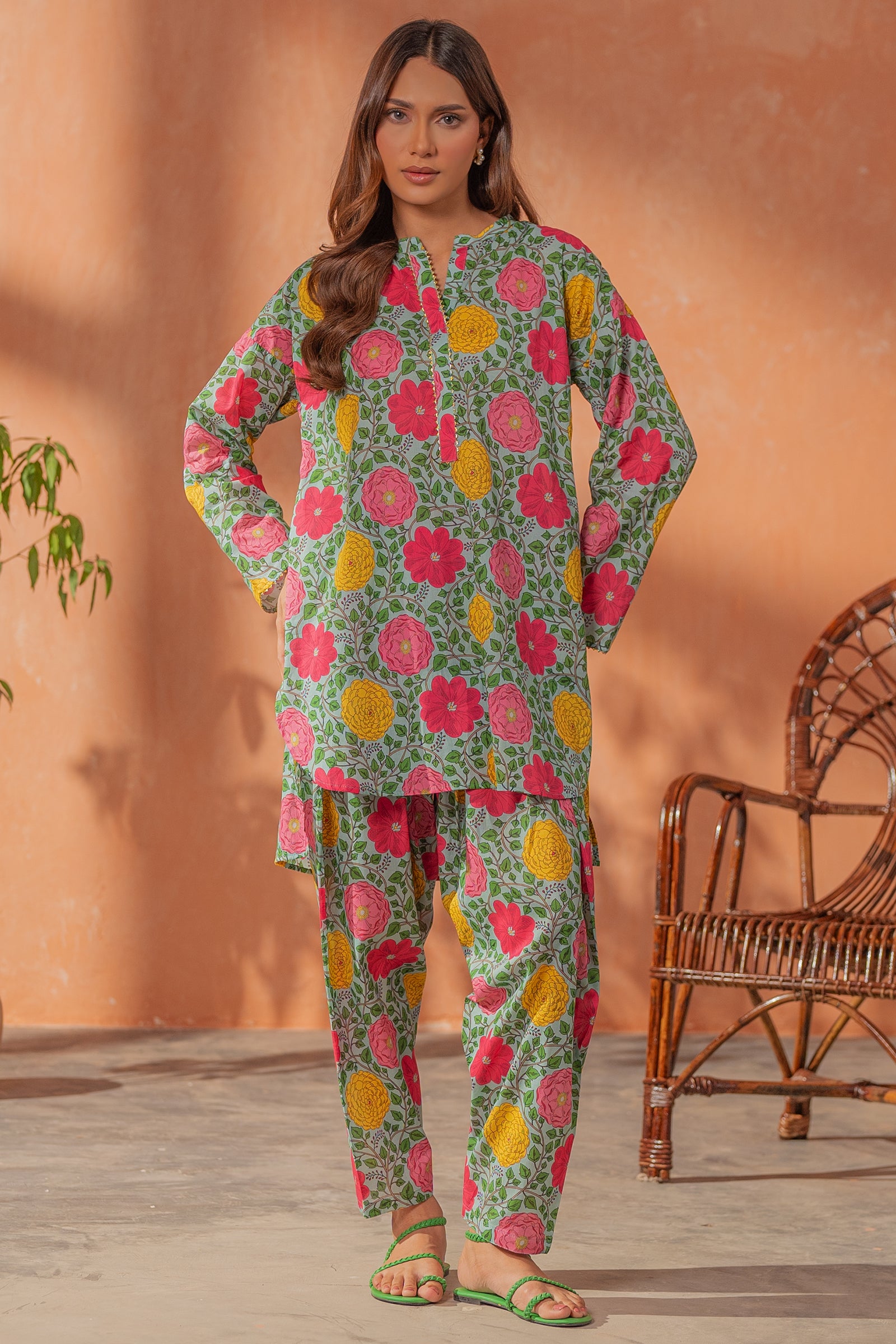 A statement in bloom — this green base ensemble adorned with bold pink and yellow florals offers comfort with standout charm. Ideal for chic daytime wear