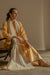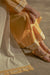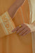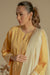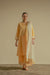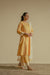 This mustard yellow three-piece set featuring a straight kurta with minimal hand screen print on the sleeves, culottes , and a printed white dupatta for a refined, elegant look.