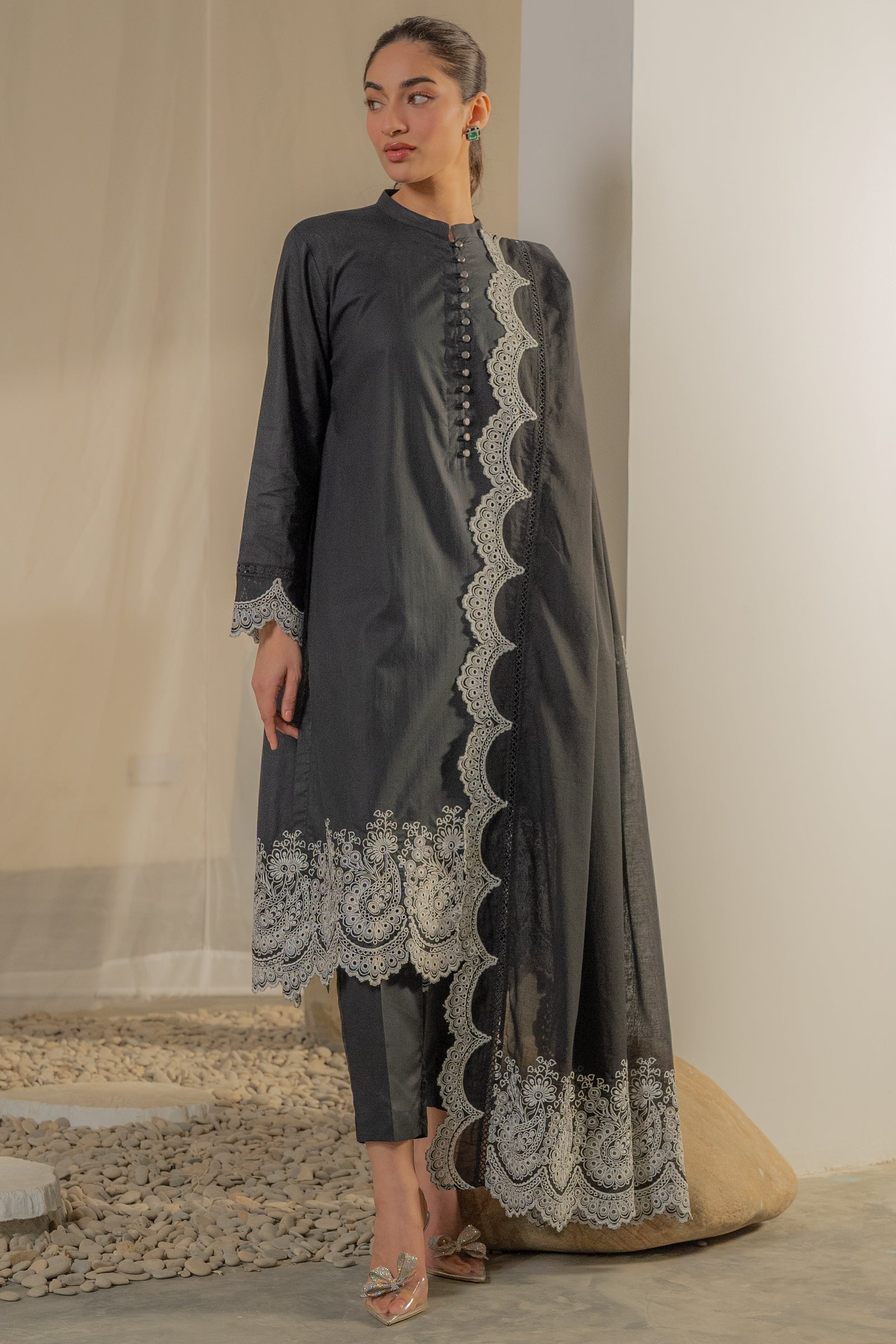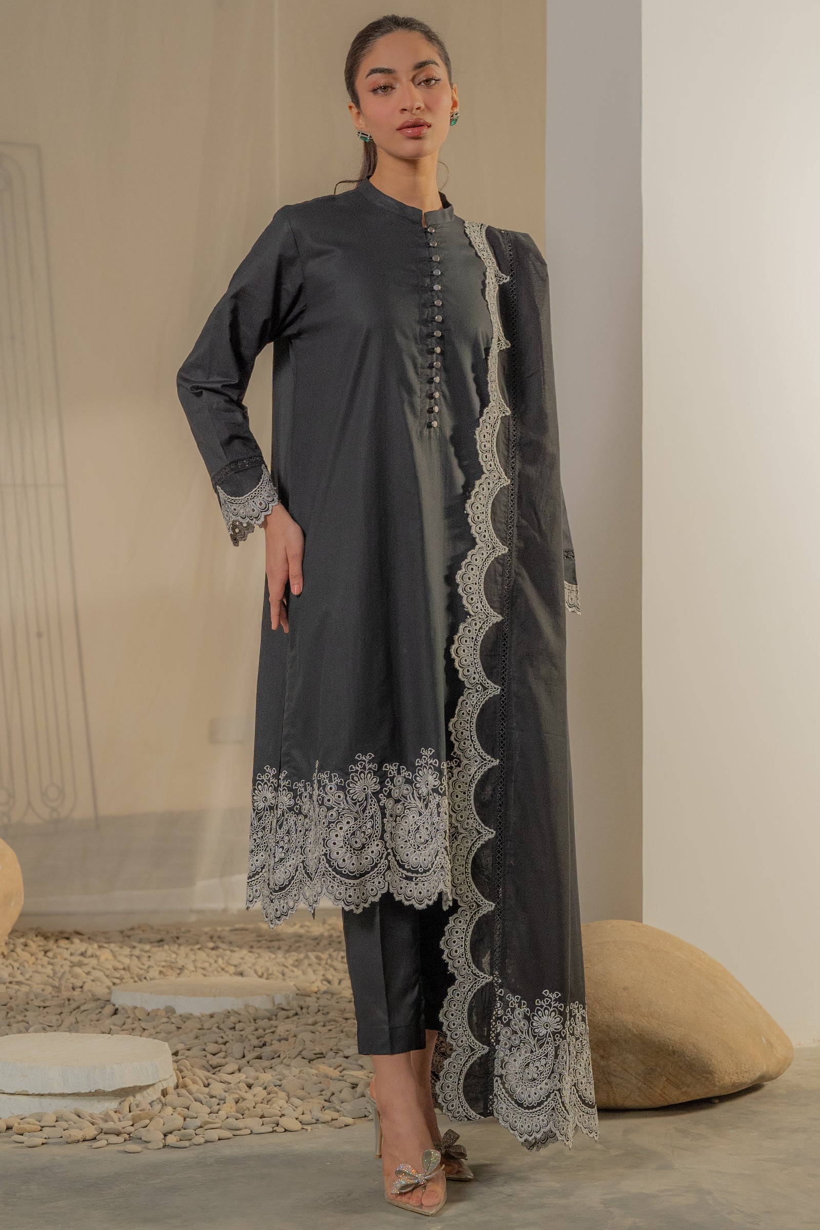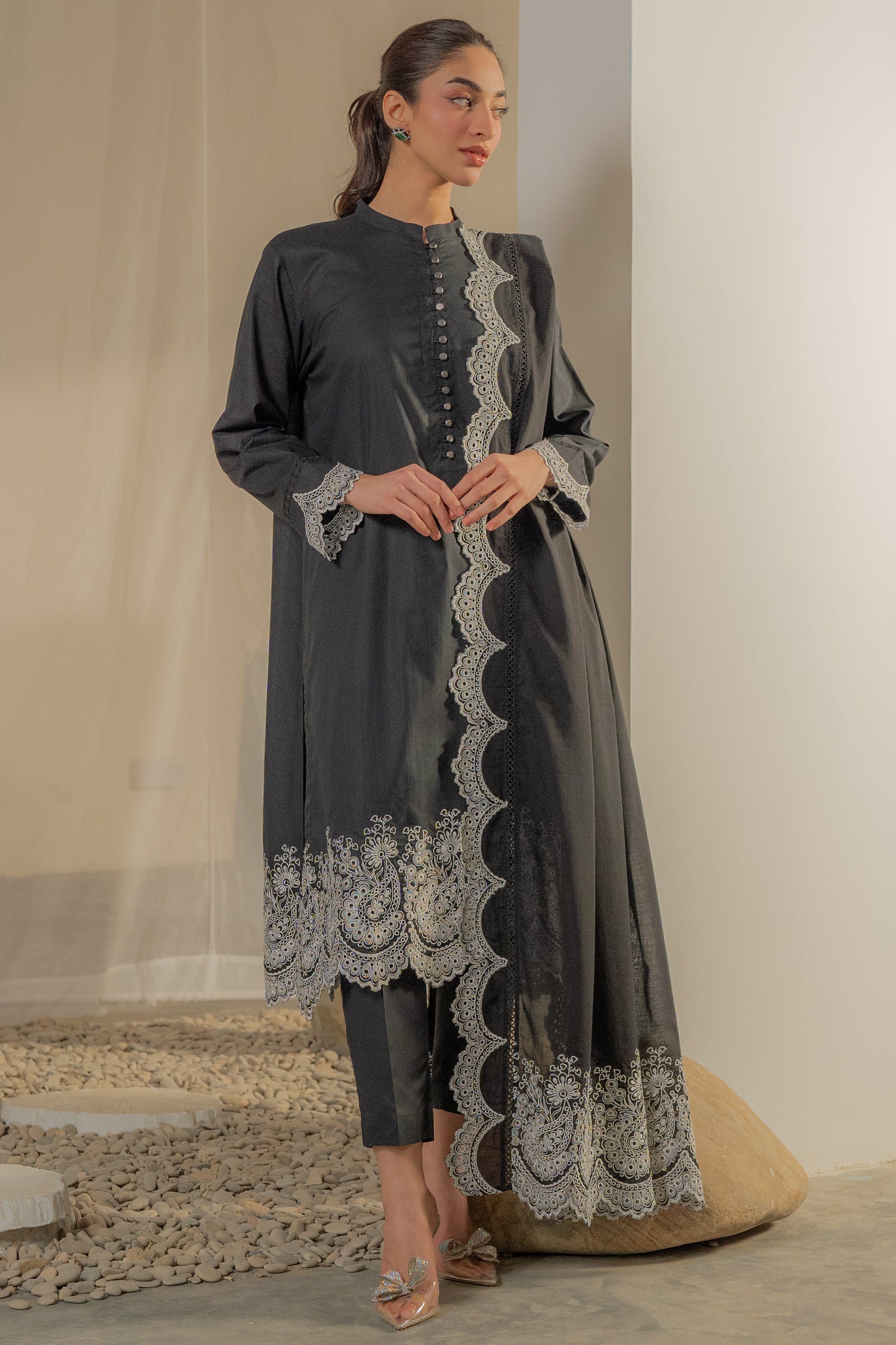 This timeless black kurta with contrast embroidery and an elegant dupatta is add elegance this festive season.