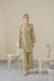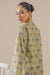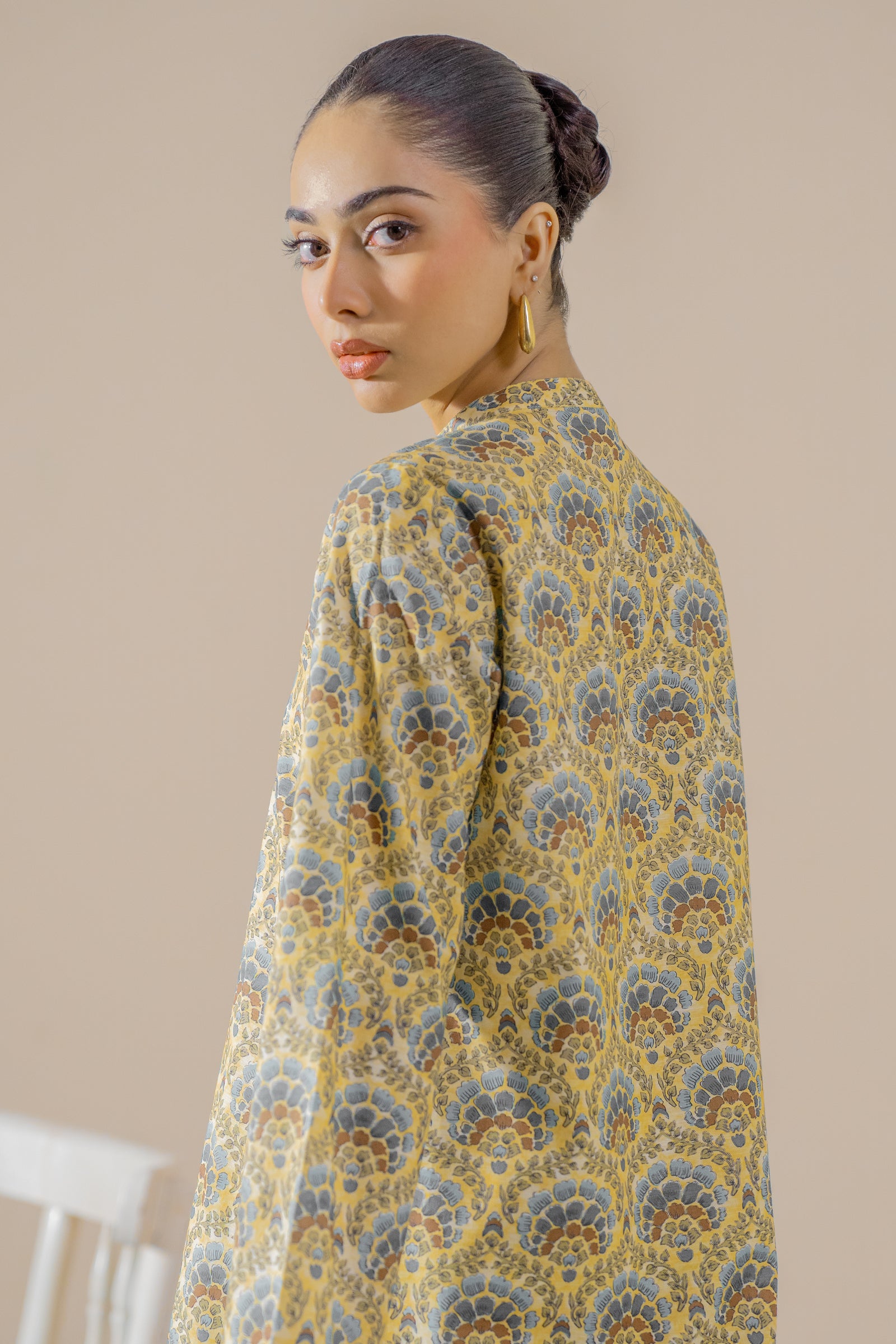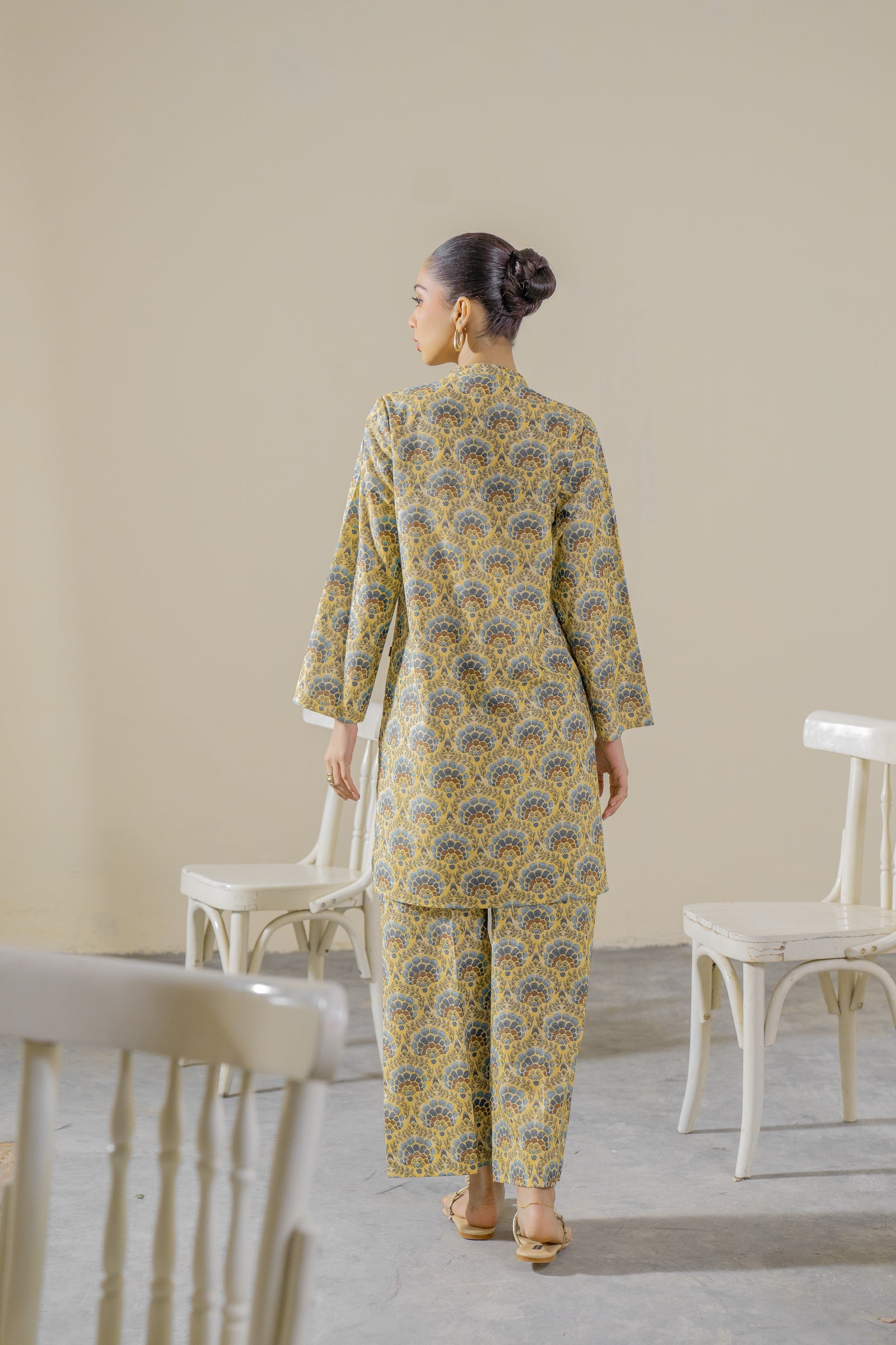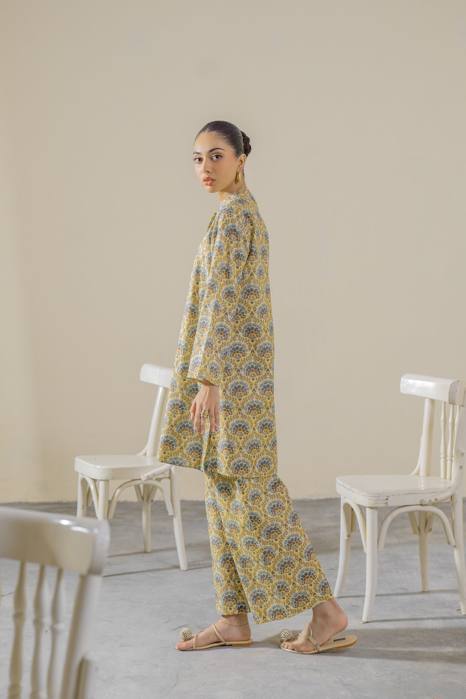 A soft yellow printed two-piece set featuring a straight mid length kurta and wide-leg trousers, designed with an elegant all-over pattern for a fresh, effortless daytime look