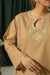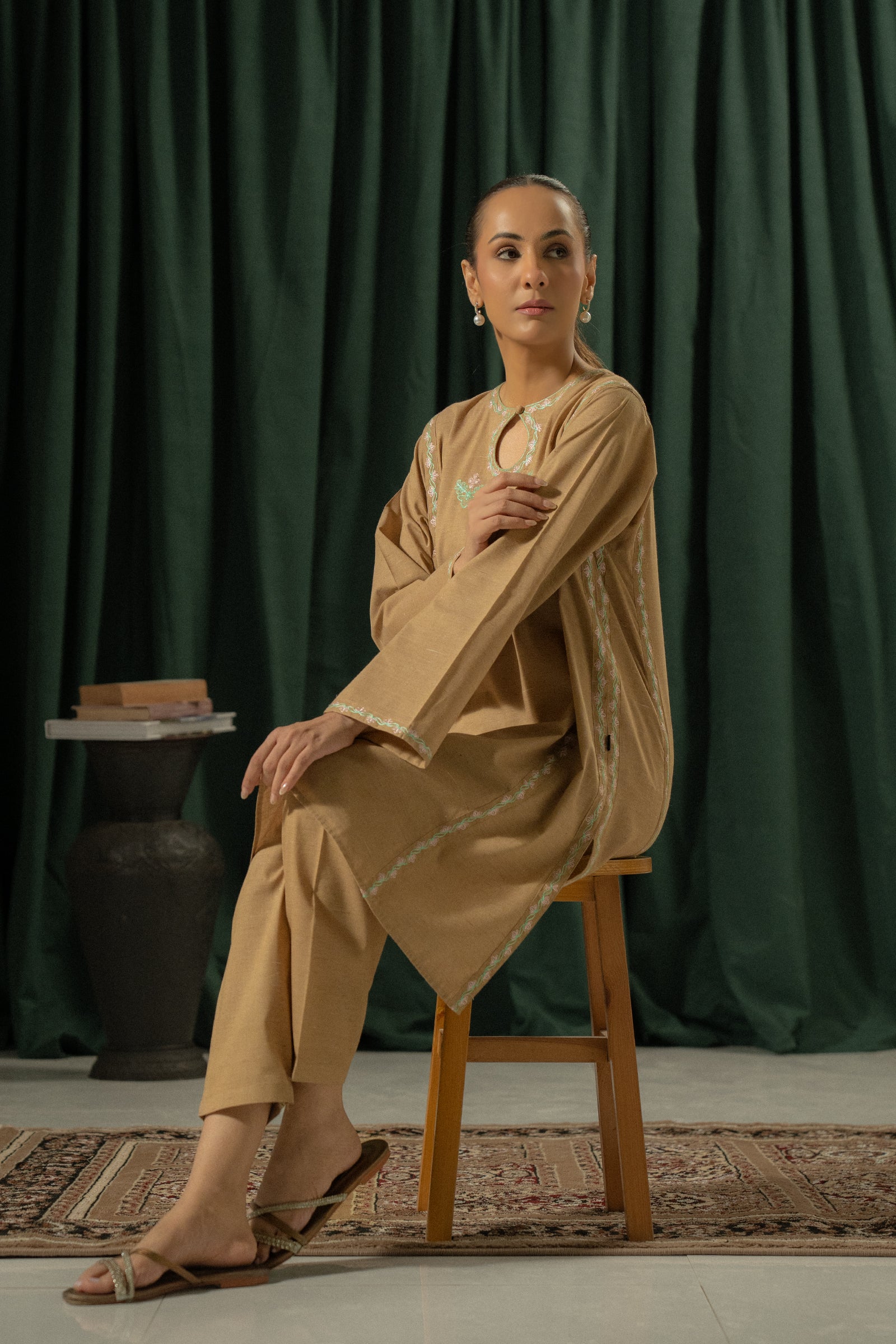 This season, embrace pure elegance with this beige emroidered kurta paired with straight pants.