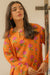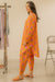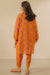 Bright orange two-piece suit featuring a straight kurta with pink floral print and matching tapered trousers, designed for a vibrant and chic casual look