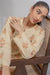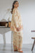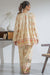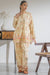 This beige two-piece printed suit featuring a straight long kurta with delicate floral patterns and border detailing, paired with matching farshi shalwar for a soft and elegant everyday look.