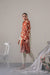 A rust colored shawl adorned with elegant floral hand screen and intricate border detailing, adding a warm, traditional touch to the outfit.