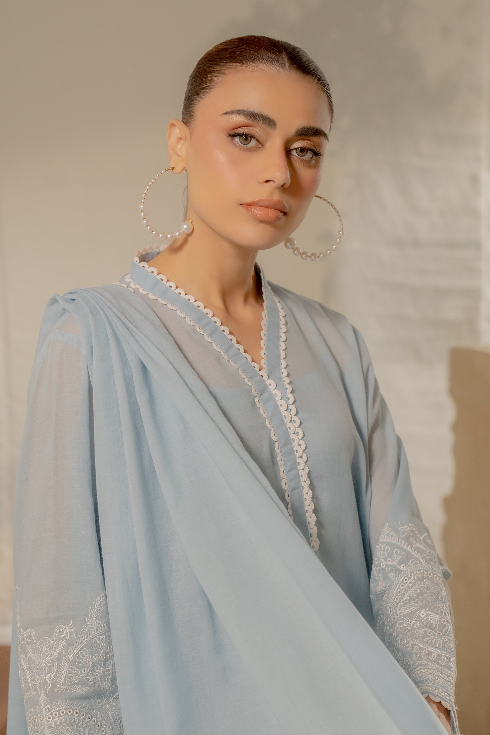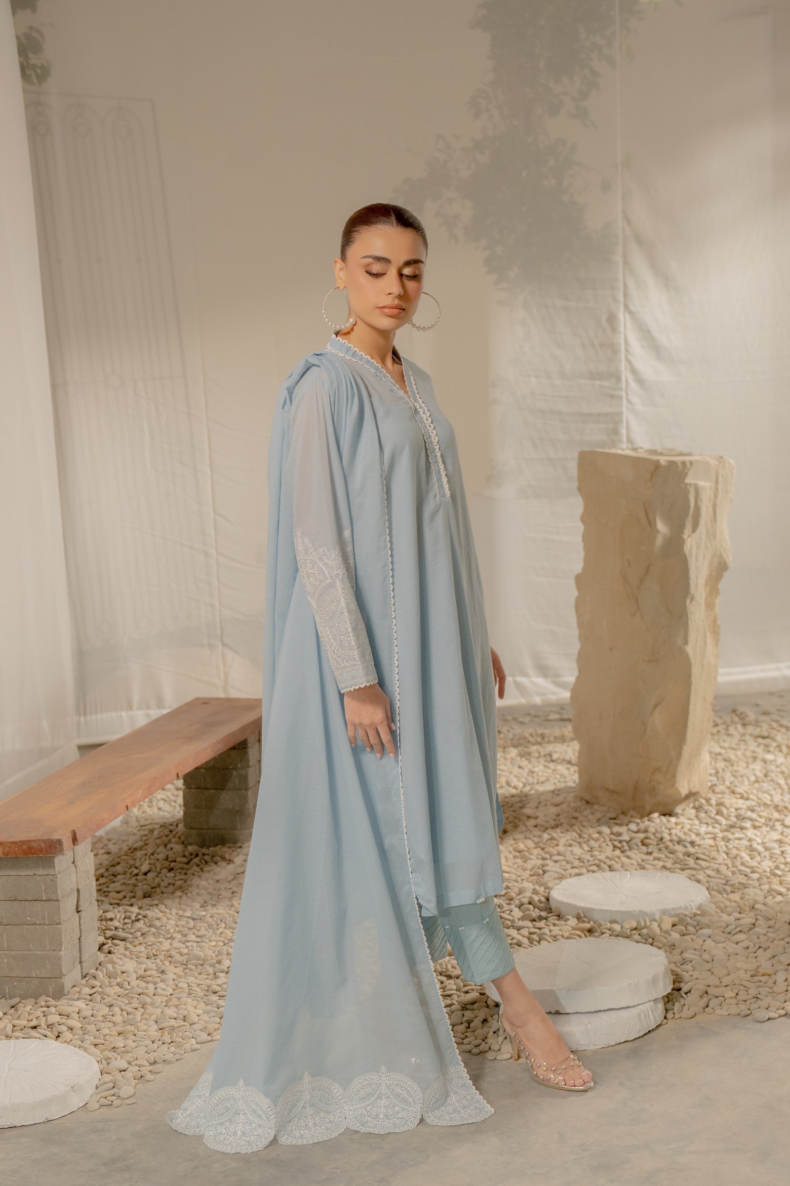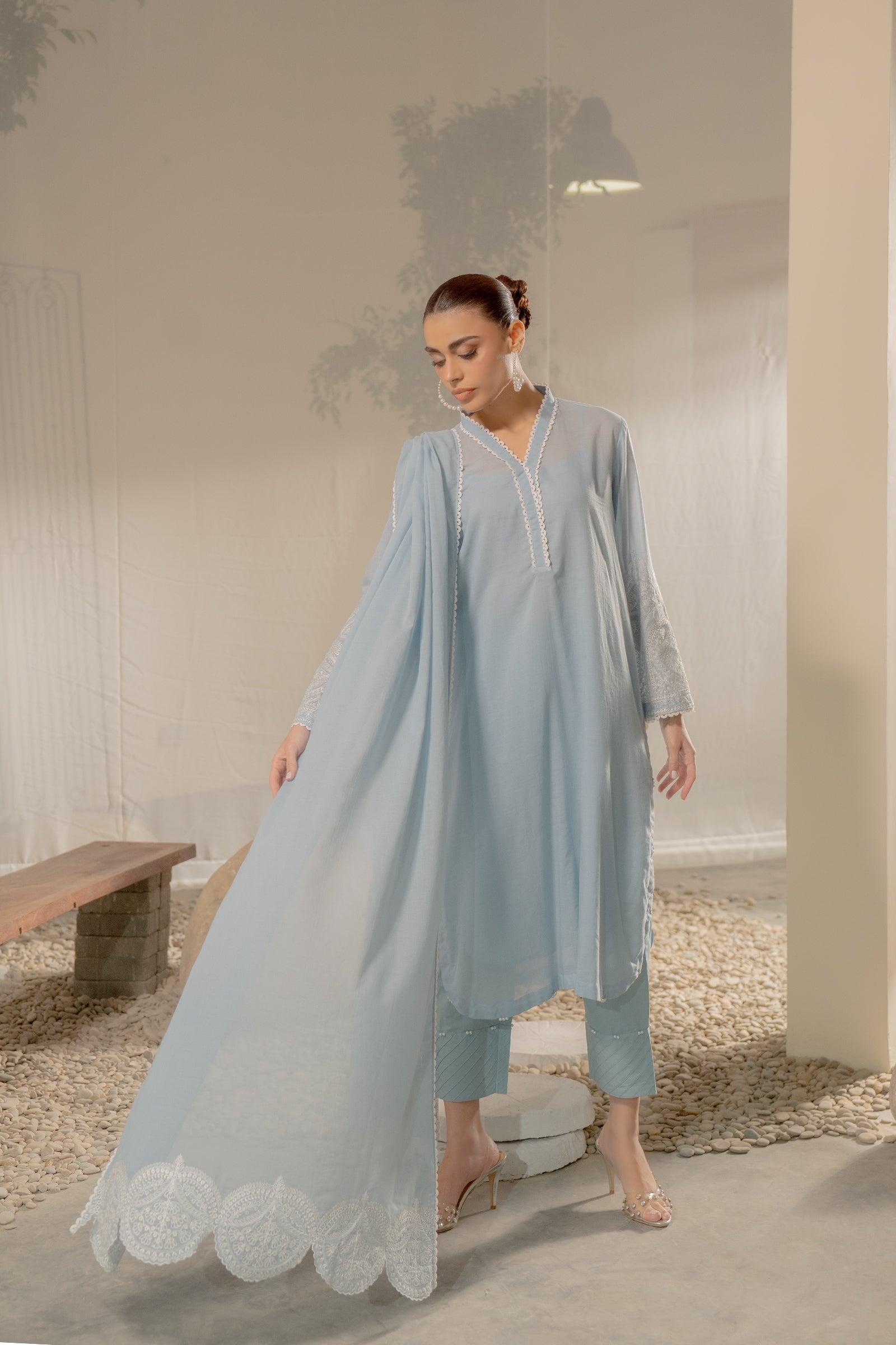 A refined sky blue ensemble featuring embroidered kurta and a beautifully embellished dupatta paired with straight pants—an elegant luxury look with soft, graceful movement.