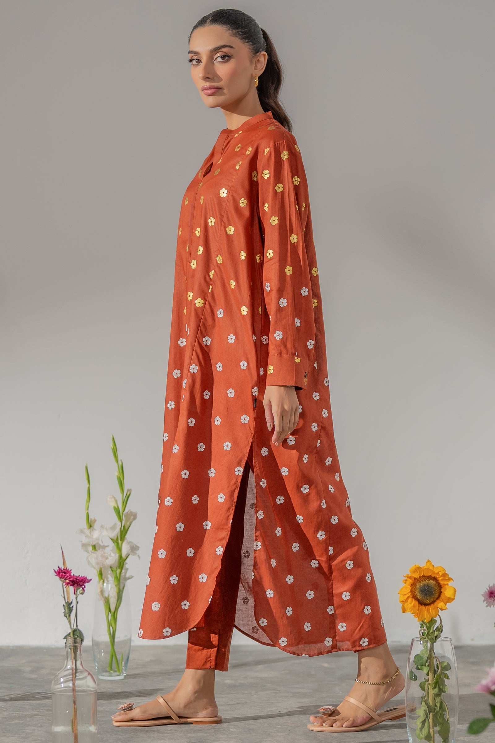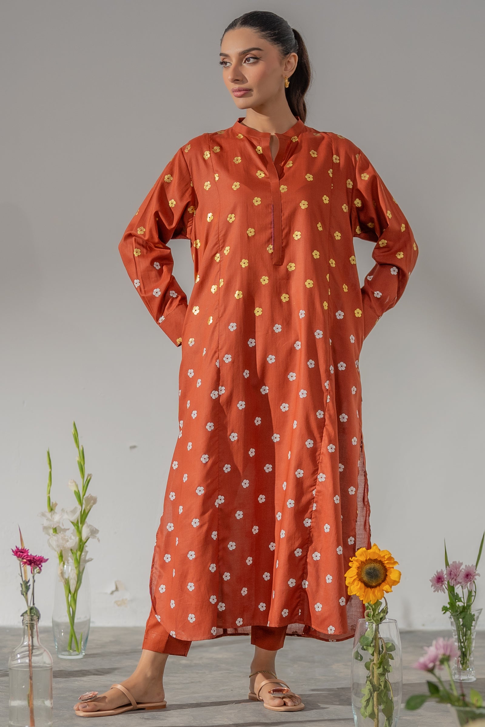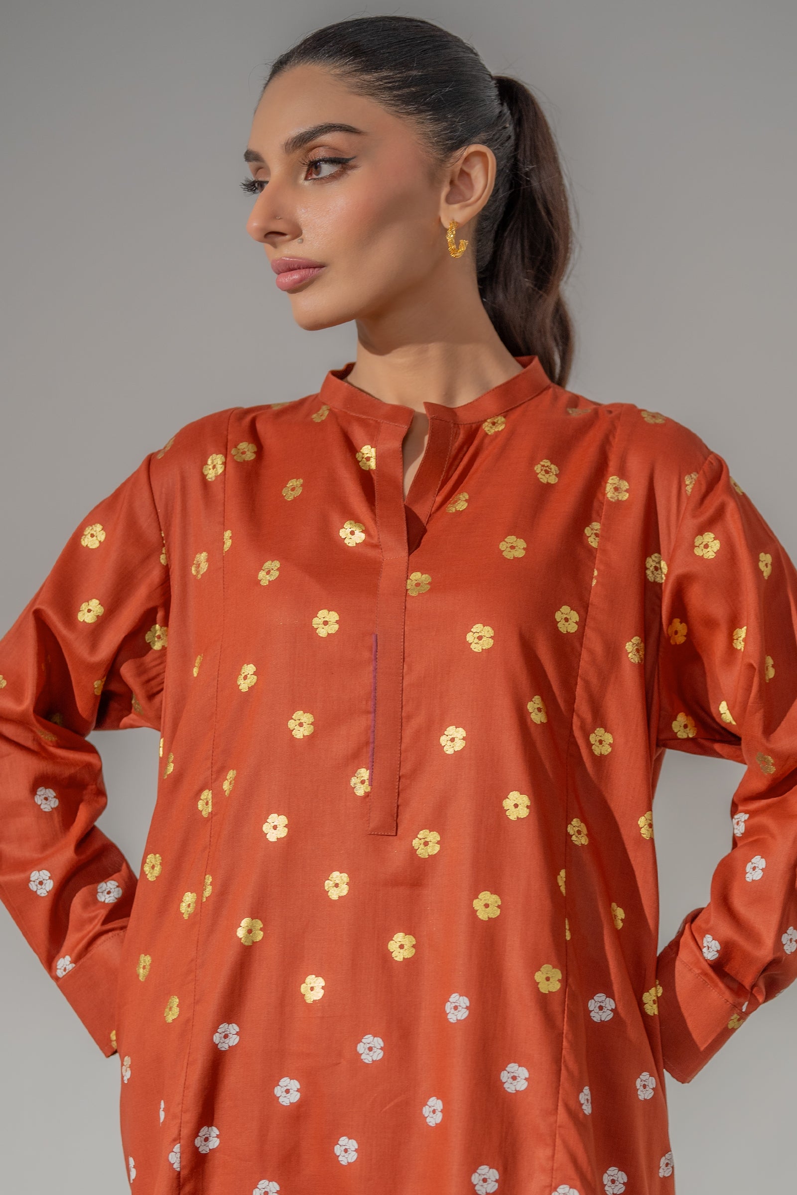 This elegant rust kurta set showcases timeless motifs and a flattering straight cut, paired with matching pants for a refined yet relaxed look