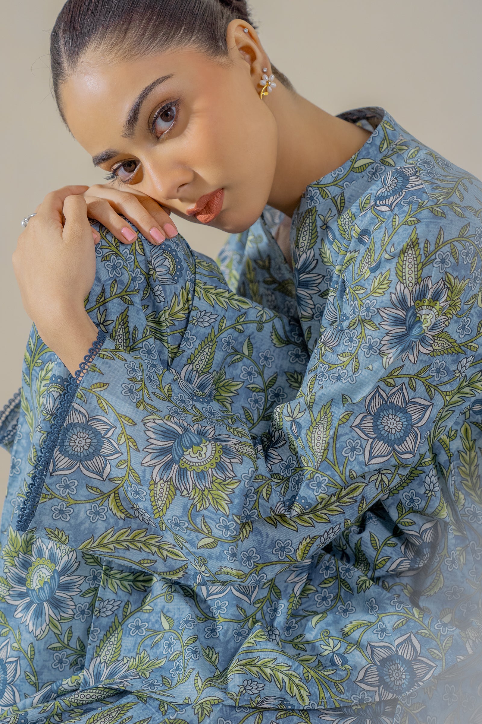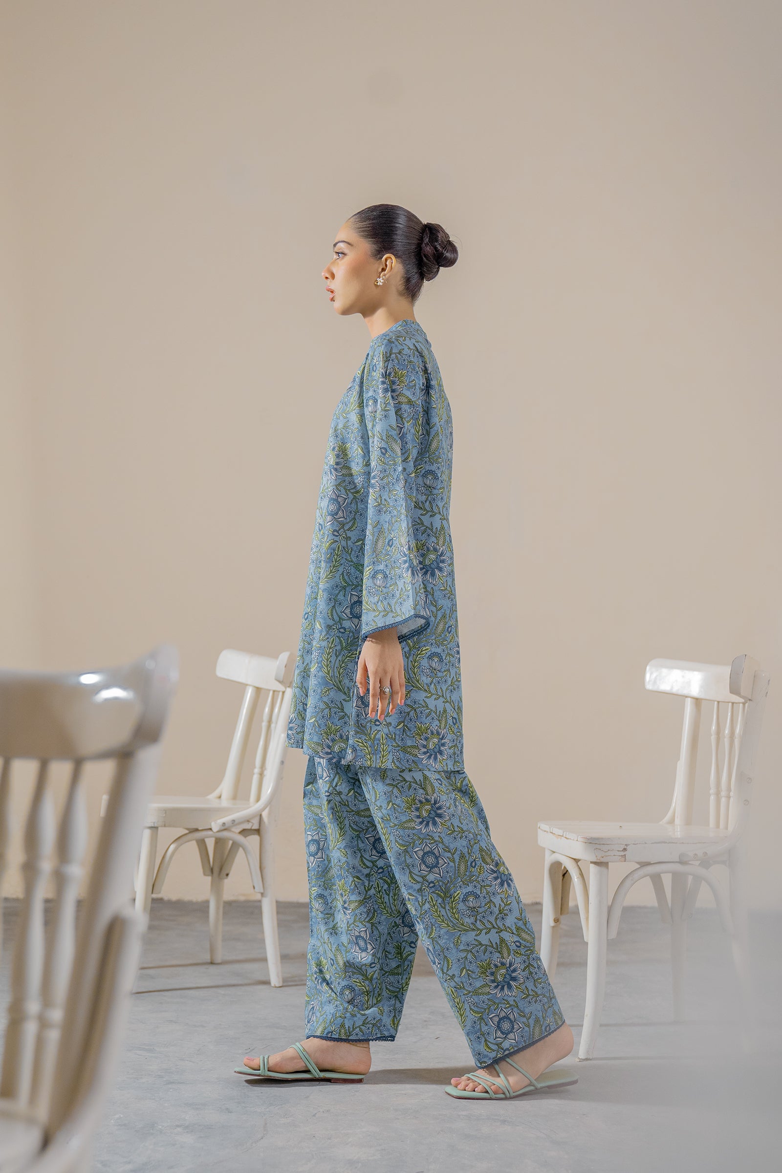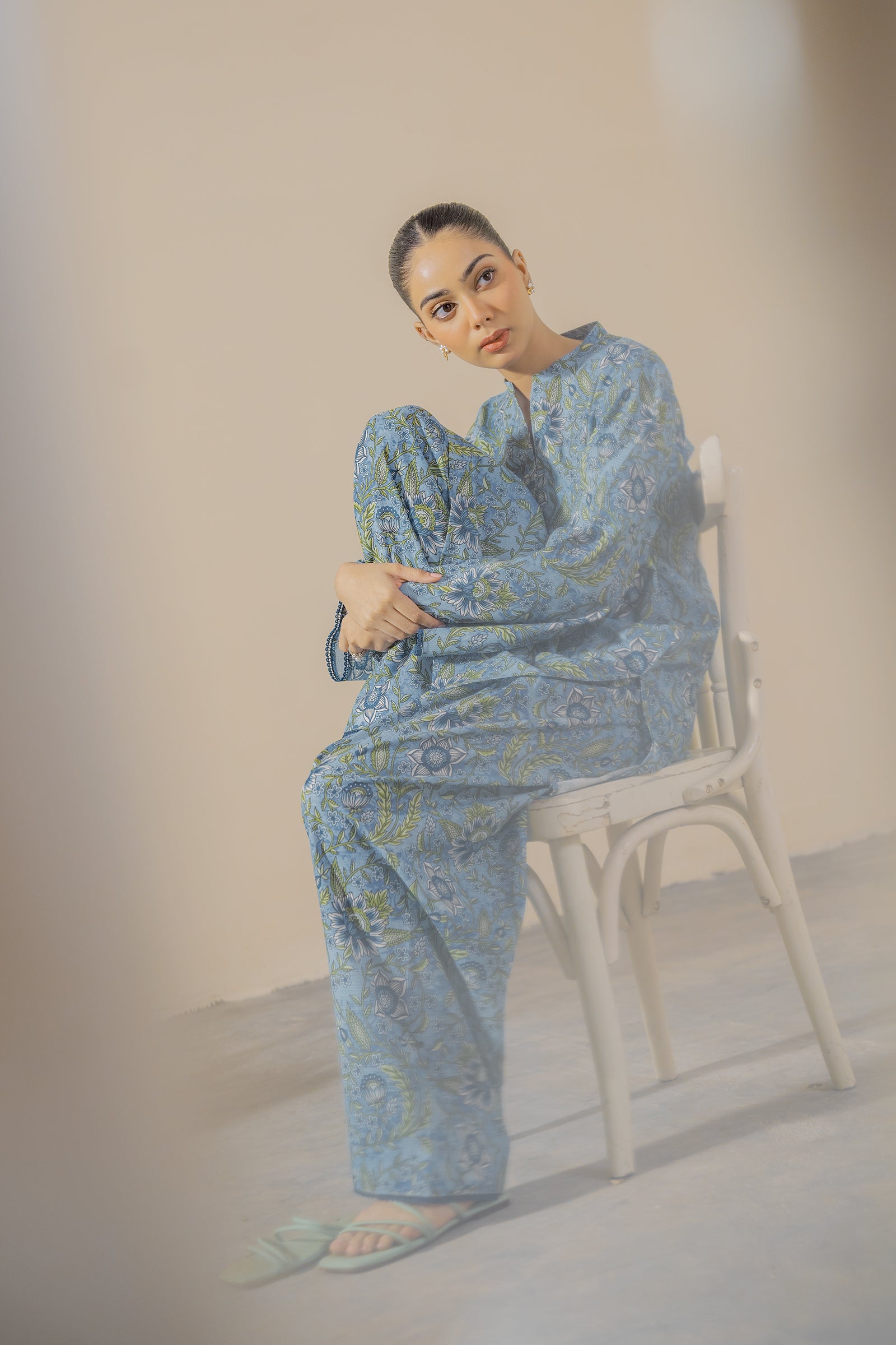 This blue colored digital print kurta and farshi shalwar is perfect for a long , comfy day this season